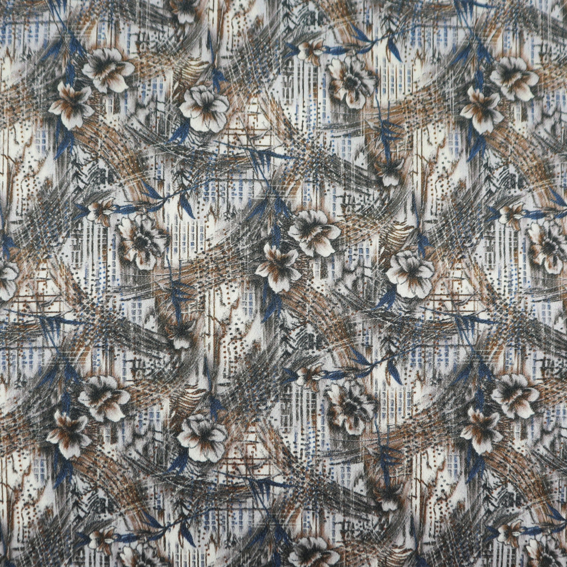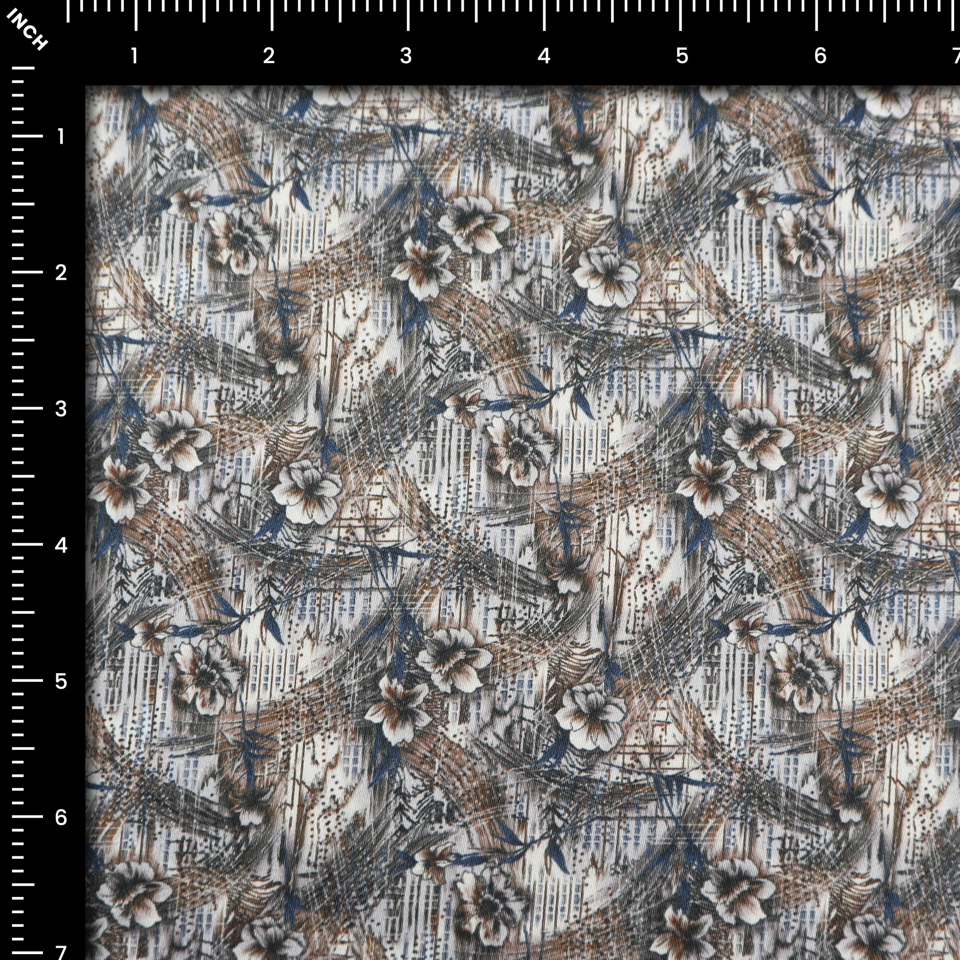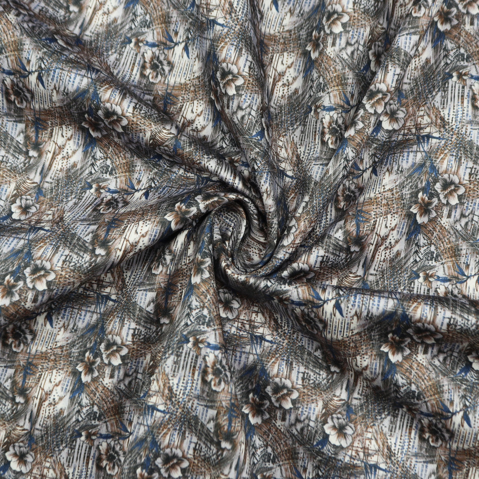 This digitally printed satin fabric showcases an expressive abstract floral composition layered with fine brushstroke textures and linear detailing. The design blends organic floral forms with artistic, almost hand-drawn elements, creating a dynamic surface that feels modern, layered, and visually rich. The all-over repeat maintains balance while offering depth and movement, making it a strong statement fabric without being overpowering.