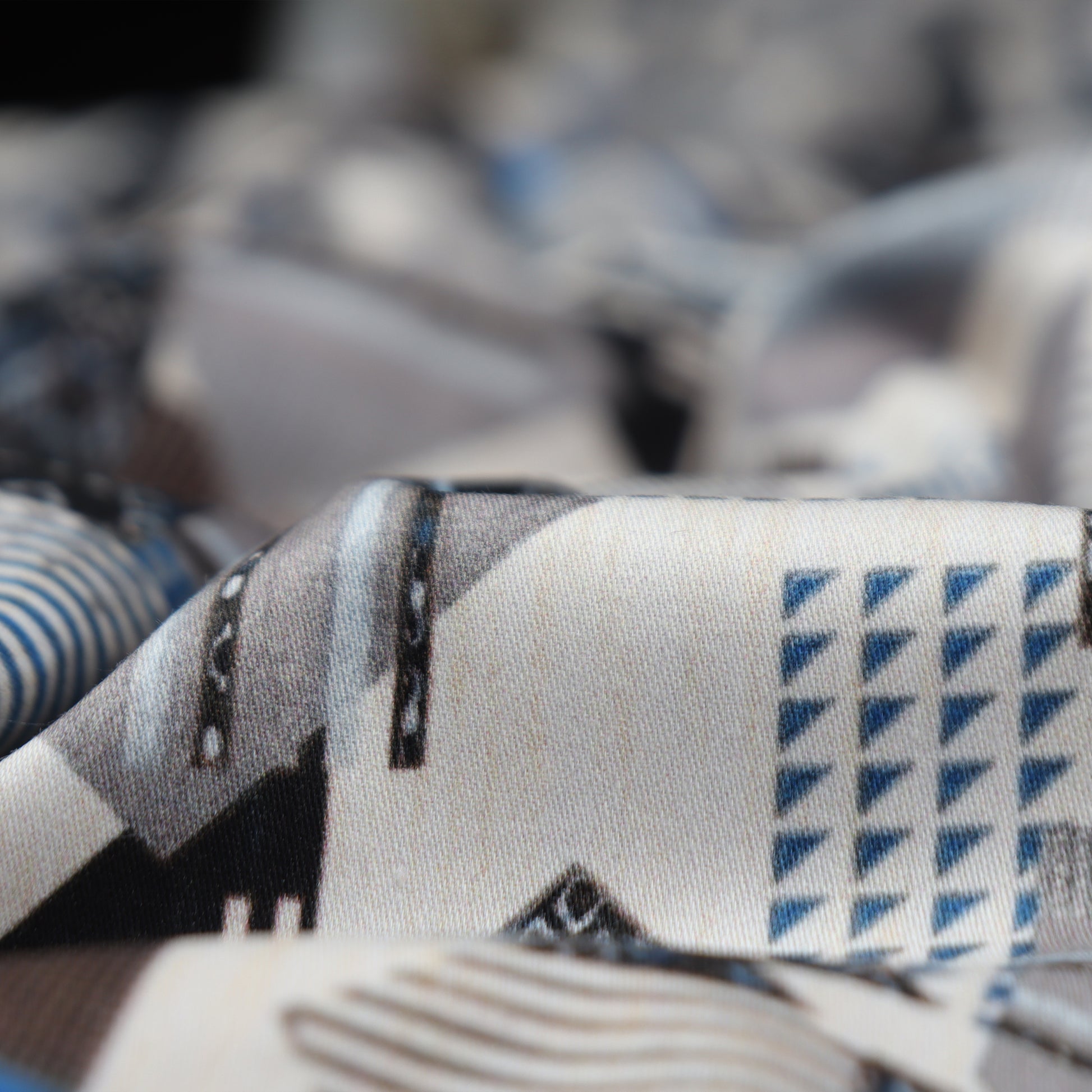 This premium digital satin fabric showcases a bold abstract geometric composition built from layered panels, sharp angles, and structured blocks. The design blends modern geometry with patterned inserts and linear accents, creating a dynamic, architectural layout that feels contemporary and expressive. Its collage-style arrangement adds visual depth while maintaining balance, making it a strong statement fabric for modern silhouettes.