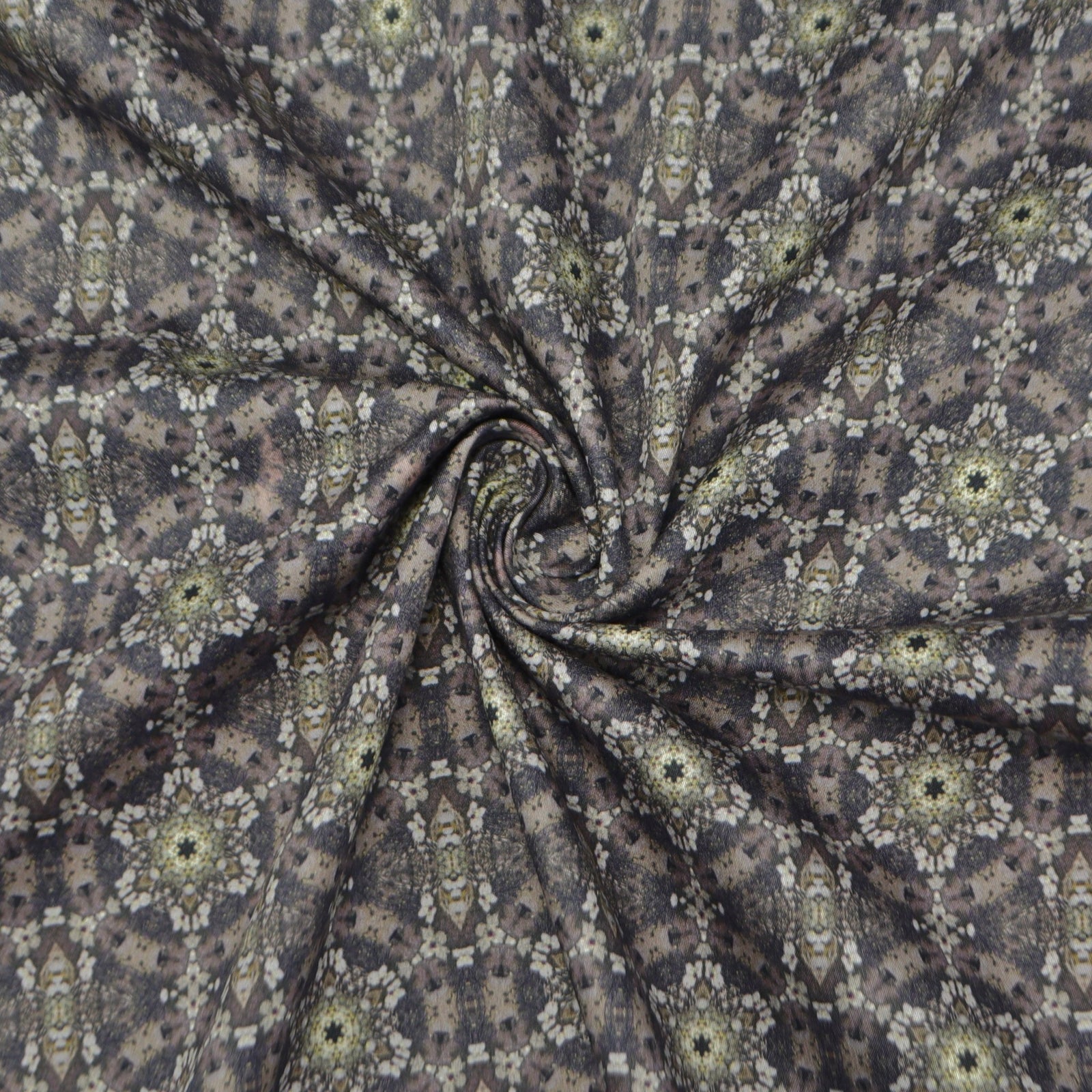 This Antique Kaleido Medallion Satin Fabric features an intricate all-over medallion pattern inspired by classic kaleidoscopic symmetry. The design is arranged in a balanced, repeating layout that creates visual depth and a refined ornamental look. The detailed motifs are evenly spaced, giving the fabric a rich yet composed appearance that feels elegant without being overwhelming. Its decorative surface makes it suitable for statement garments and premium collections.