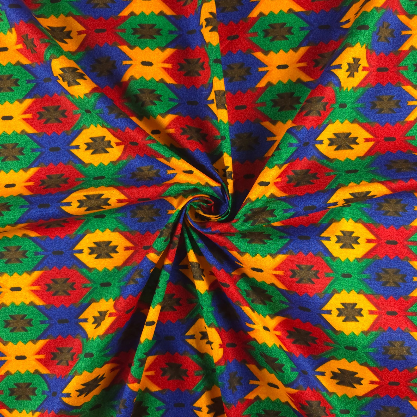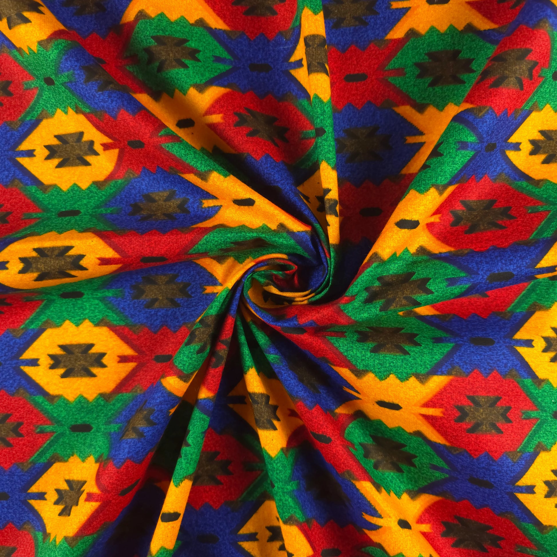 Crafted in poplin weave, this fabric offers a smooth, tightly woven surface with a soft yet slightly crisp hand feel. The fine construction enhances print clarity, allowing the intricate geometric motifs to appear sharp, defined, and visually impactful. Lightweight and breathable, it ensures comfortable wear while maintaining enough body to support structured garments. The fabric drapes neatly without excessive stiffness, making it easy to cut, stitch, and tailor into refined outfits.