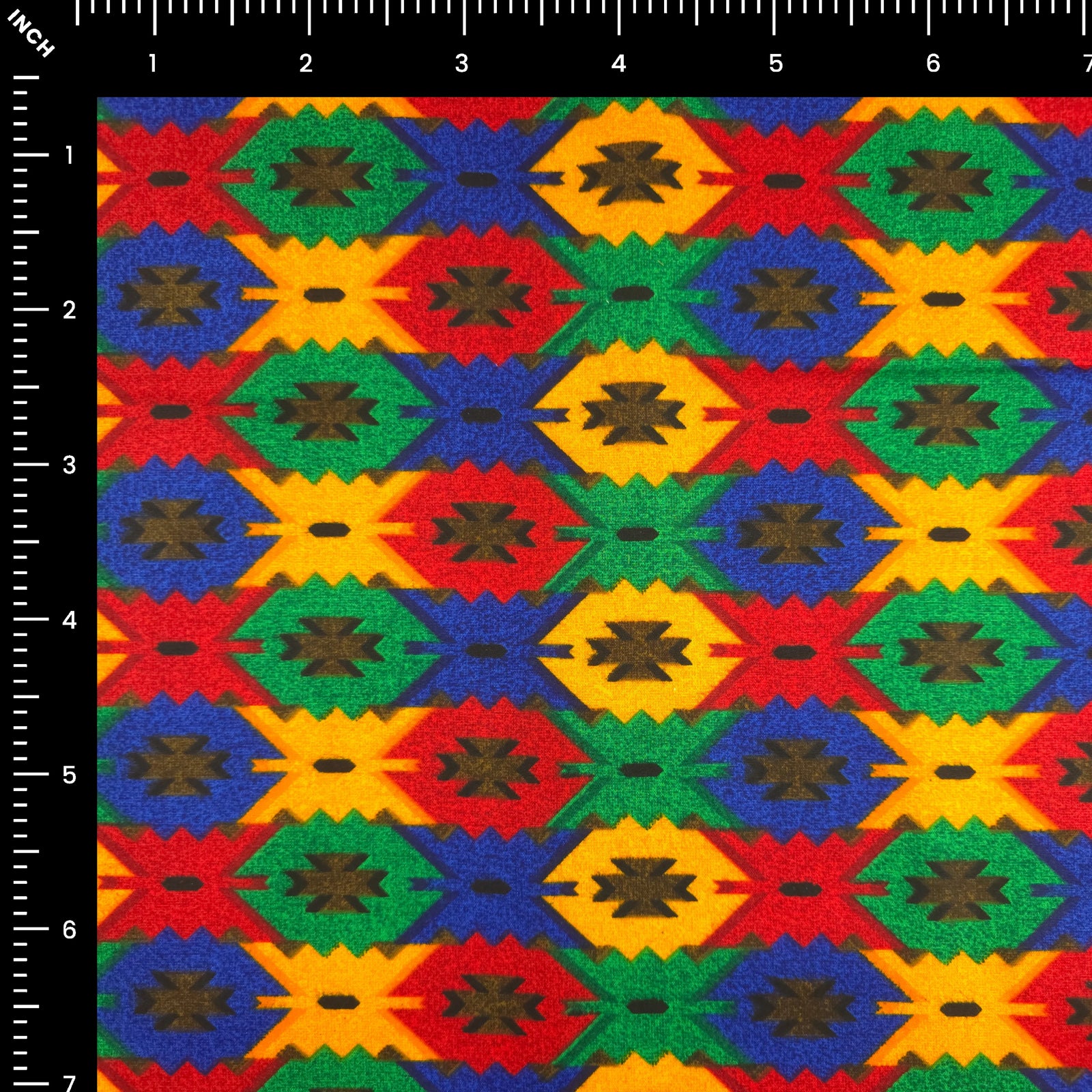 Artisan Dhaka Pattern Printed Fabric features a vibrant all-over geometric arrangement inspired by traditional Nepali Dhaka artistry. The pattern is composed of structured diamond medallions with serrated edges and central accent motifs, arranged in a rhythmic and balanced repeat. The symmetrical alignment of shapes creates a bold yet harmonious ethnic aesthetic that reflects cultural heritage while maintaining a clean and visually striking finish suitable for both traditional and contemporary silhouettes.
