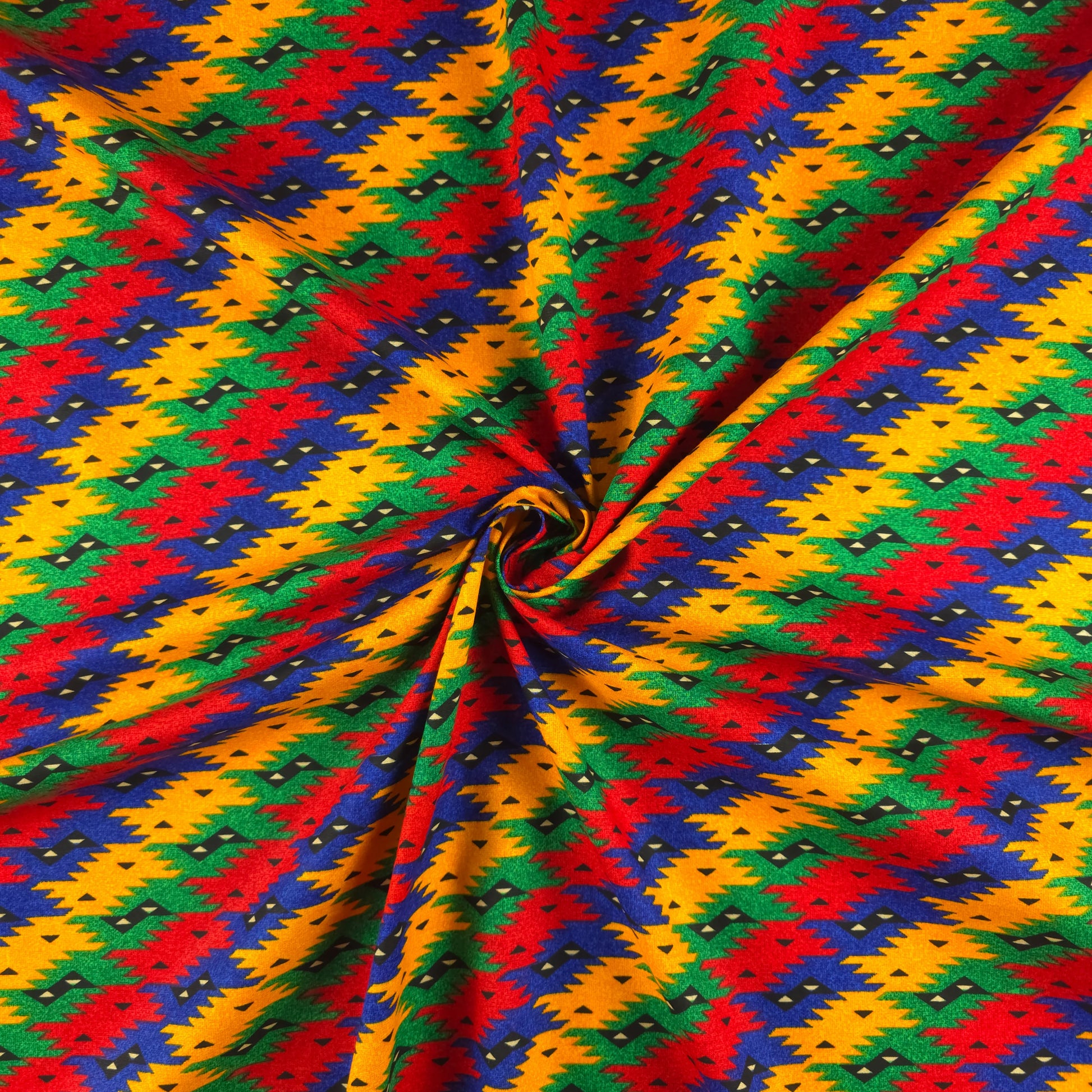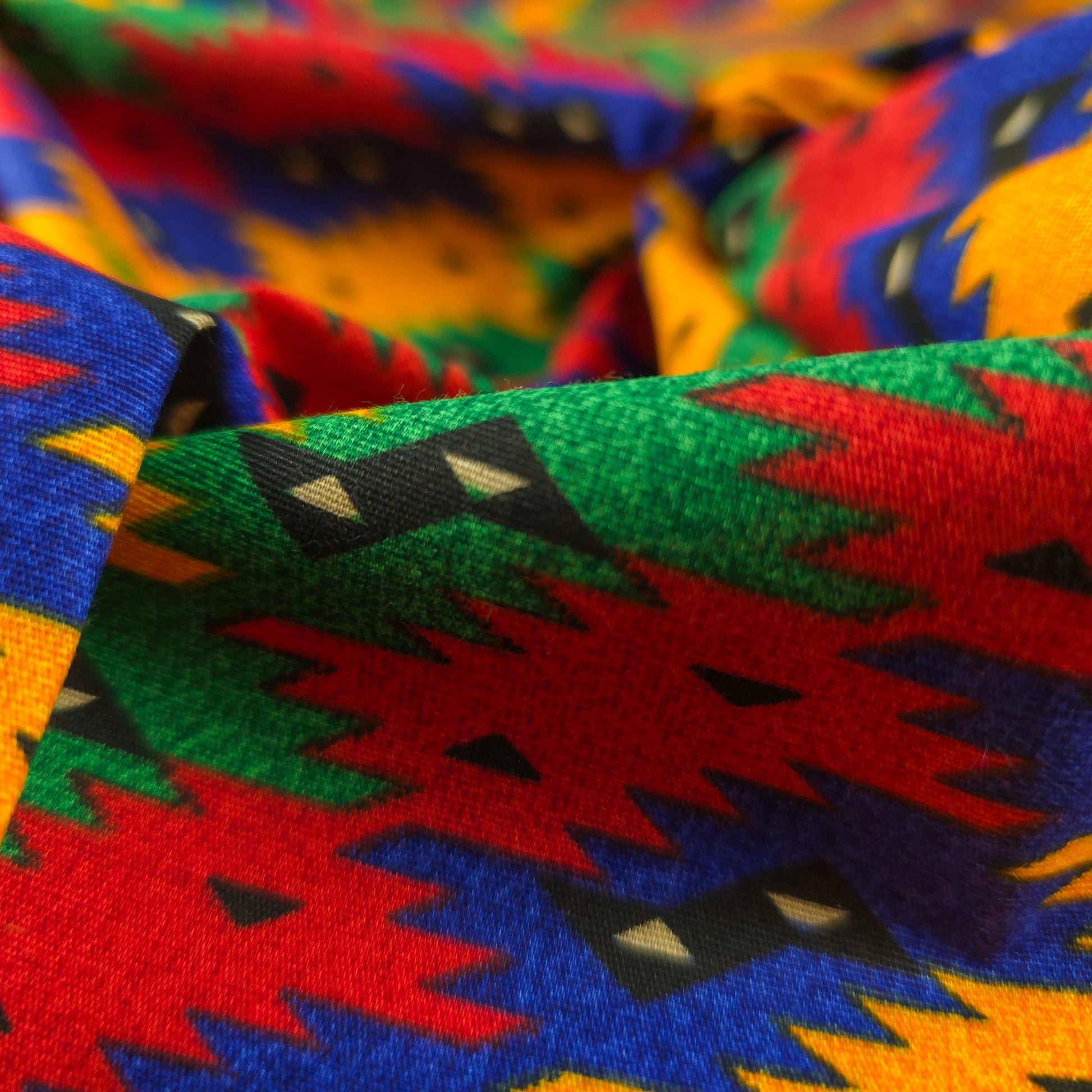 Authentic Nepali Dhaka Print Fabric features a vibrant all-over geometric arrangement inspired by traditional Nepali Dhaka artistry. The pattern is composed of layered diamond forms, serrated zigzag edges, and small accent motifs arranged in a balanced repeat, creating a bold yet structured ethnic aesthetic. The design reflects cultural richness and traditional craftsmanship while maintaining a clean and visually dynamic finish, making it suitable for both classic ethnic wear and contemporary silhouettes.