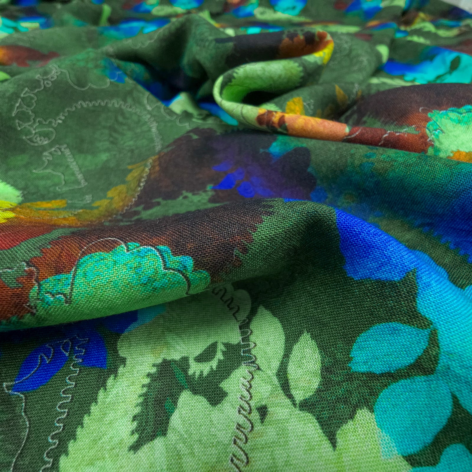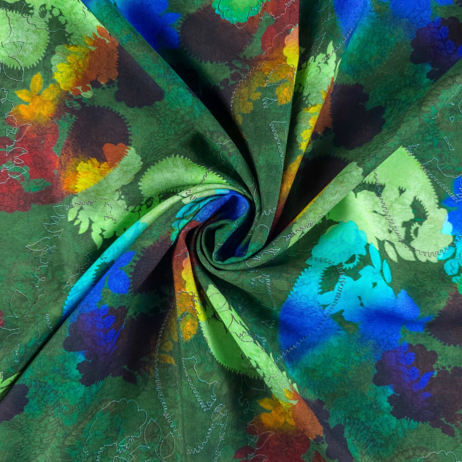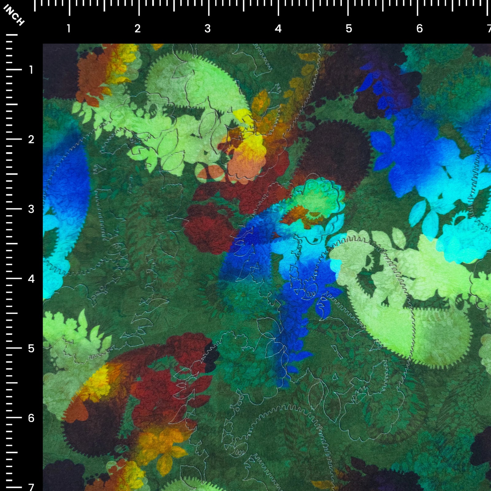 Autumn Garden Abstract Printed Rayon Fabric showcases an artistic blend of organic shapes and layered botanical impressions arranged in a flowing repeat pattern. The design features abstract floral silhouettes and textured overlays that create depth and visual richness across the surface. The composition feels expressive and painterly, giving the fabric a contemporary yet nature-inspired appeal that stands out beautifully in statement garments.