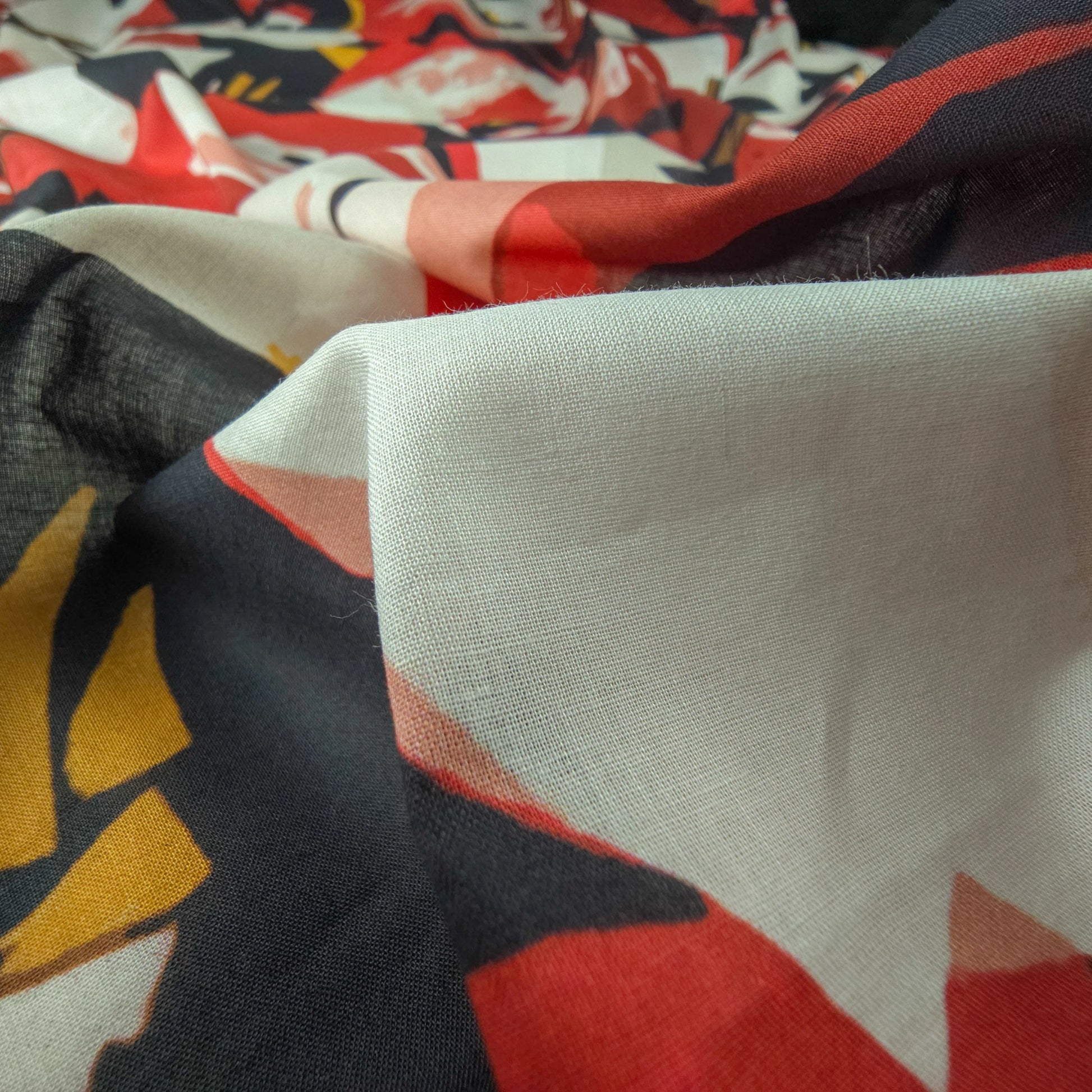 Crafted in premium cambric with digital print technology, this fabric offers a smooth and soft surface with a lightweight, breathable feel. The fine weave enhances print clarity, allowing the bold brushstroke elements to appear sharp and well-defined. It drapes comfortably while retaining enough structure for tailored cuts and clean garment construction. Easy to handle during cutting and stitching, the fabric supports neat seams and refined finishes.