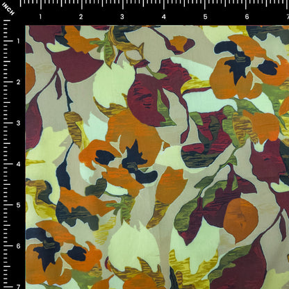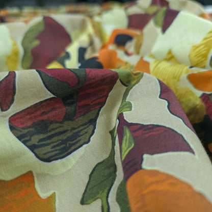 Bold Tropical Floral Printed Cambric Fabric features oversized floral blooms and expressive foliage arranged in a dynamic, eye-catching composition. The design blends large petal forms with layered leaves and artistic brush-style detailing, creating a rich tropical aesthetic. The bold scale of the motifs gives the fabric a strong visual presence, making it ideal for statement garments that stand out while still maintaining a balanced and refined look. The digital print technique enhances the clarity and depth of each element, ensuring sharp outlines and smooth tonal transitions across the surface.