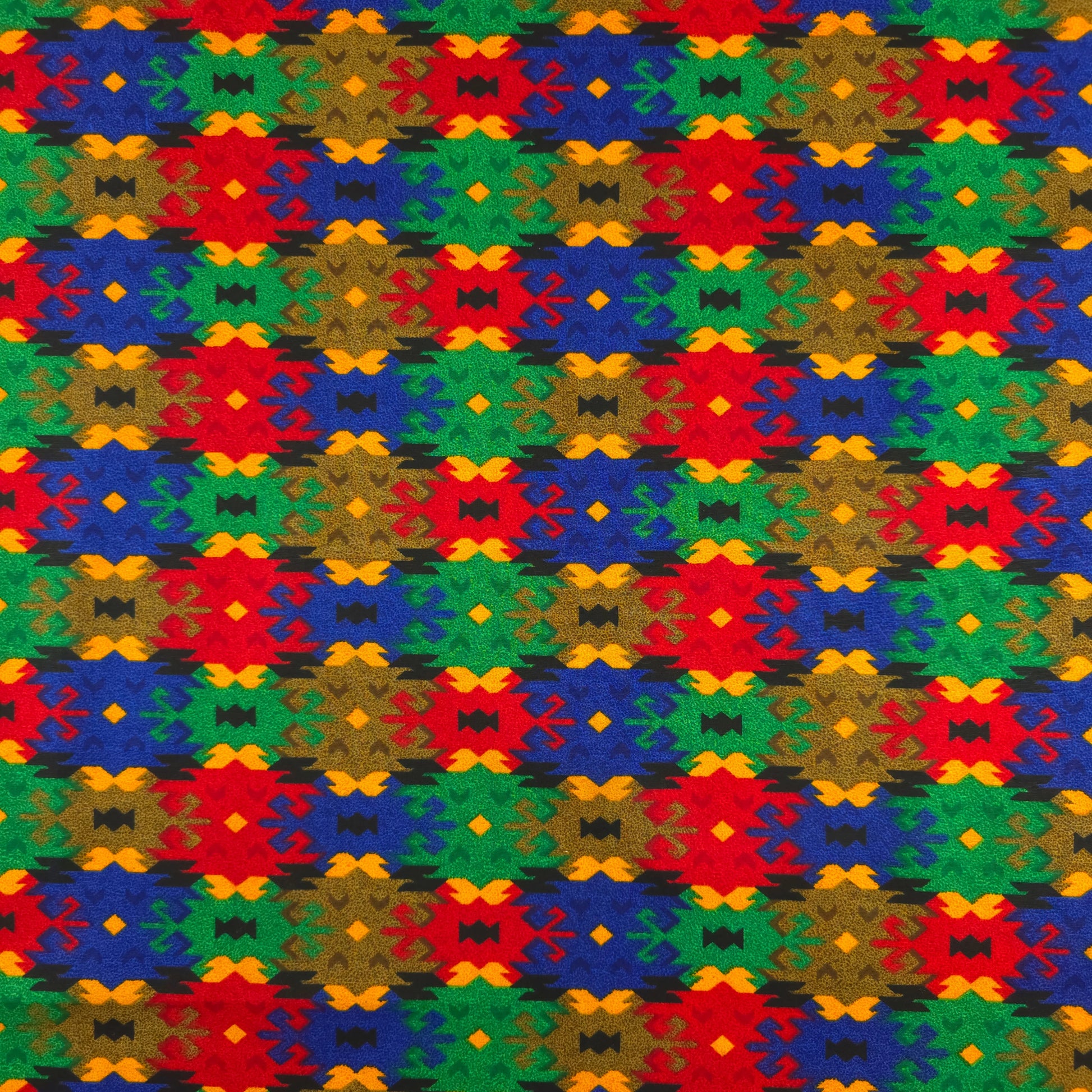 Classic Tribal Dhaka Print Fabric showcases a bold all-over geometric composition inspired by traditional Nepali Dhaka craftsmanship. The design features symmetrical tribal motifs arranged in a rhythmic horizontal repeat, combining angular shapes, stylized diamond elements, and folk-inspired forms. The structured placement of motifs creates a strong visual balance, reflecting cultural depth while maintaining a clean and adaptable aesthetic suitable for both traditional attire and contemporary fashion silhouettes.