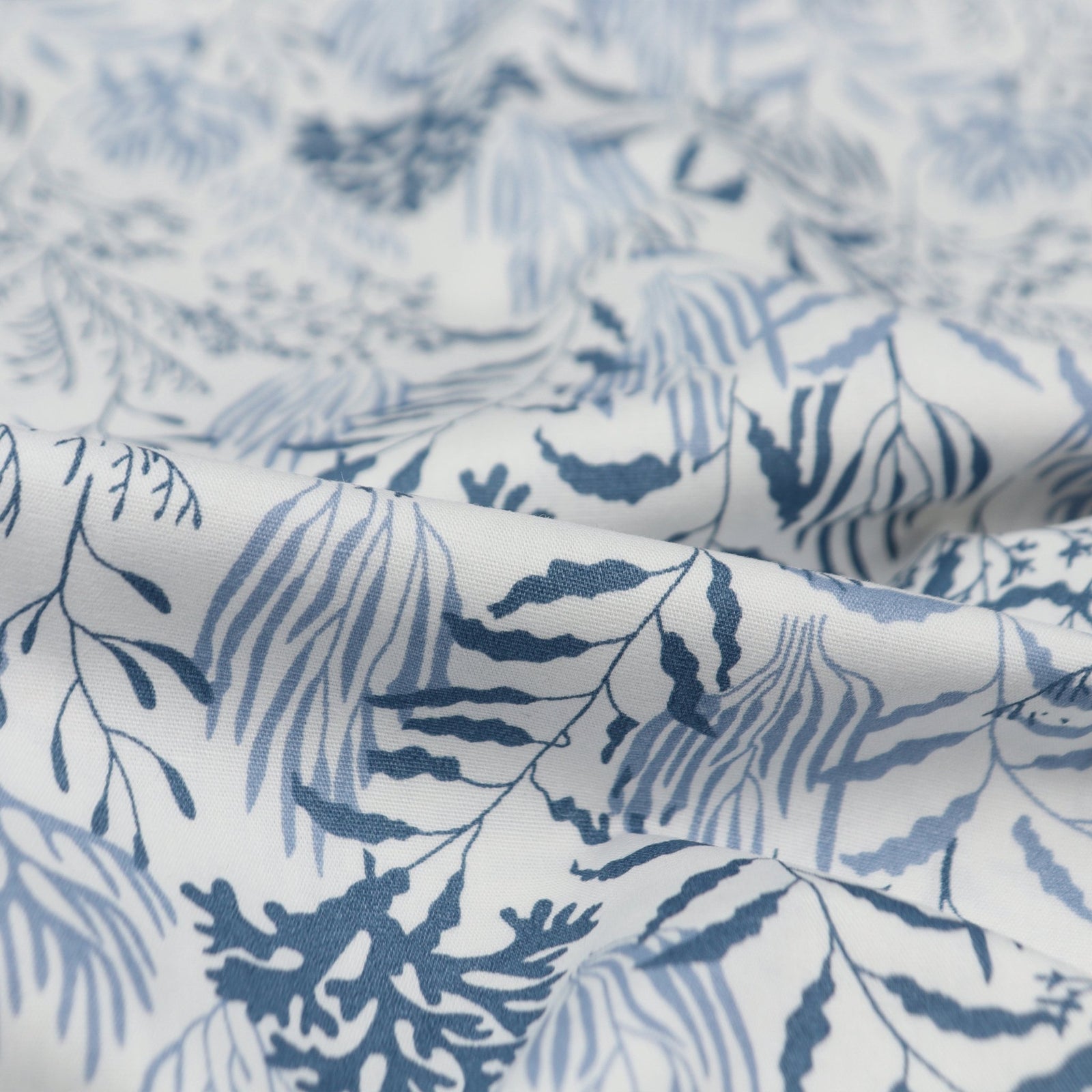 Elegant Botanical Leaf Poplin Fabric presents an organic, nature-inspired composition formed by flowing botanical silhouettes and layered foliage motifs. The arrangement feels airy and balanced, with overlapping elements that create gentle movement across the surface. The pattern has a calming, understated character, making it visually engaging without overpowering a design. Its natural rhythm lends itself well to garments that aim for softness, elegance, and everyday wearability while still carrying a refined decorative appeal.