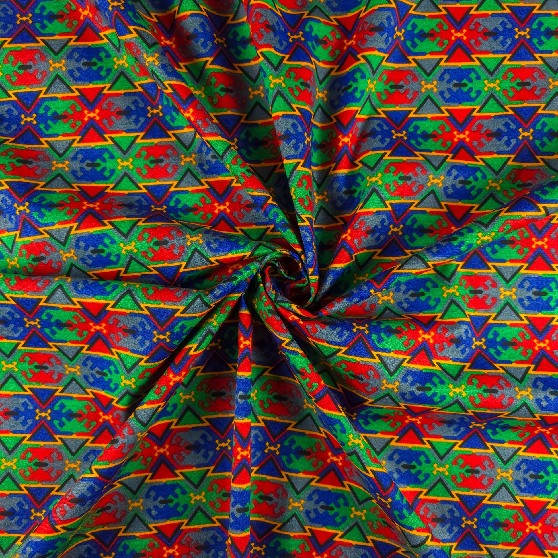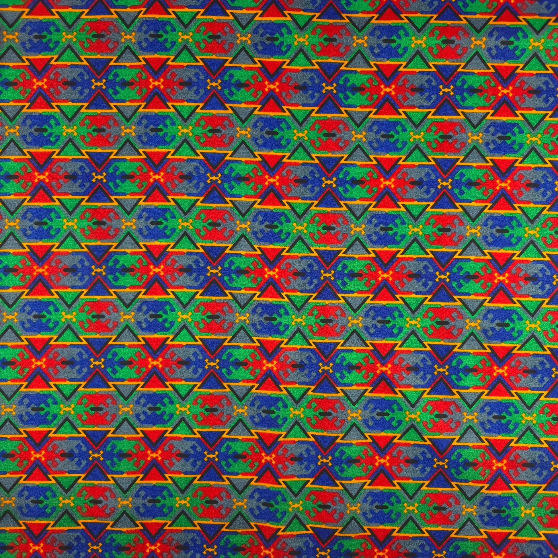 Ethnic Geometric Dhaka Poplin Fabric features a vibrant all-over geometric arrangement inspired by traditional Nepali Dhaka artistry. The design is composed of structured triangular formations, diamond accents, and stylized cultural motifs arranged in a rhythmic horizontal repeat. The layered geometry creates a bold and dynamic ethnic aesthetic while maintaining a balanced and contemporary finish, making it suitable for both heritage-inspired garments and modern silhouettes.