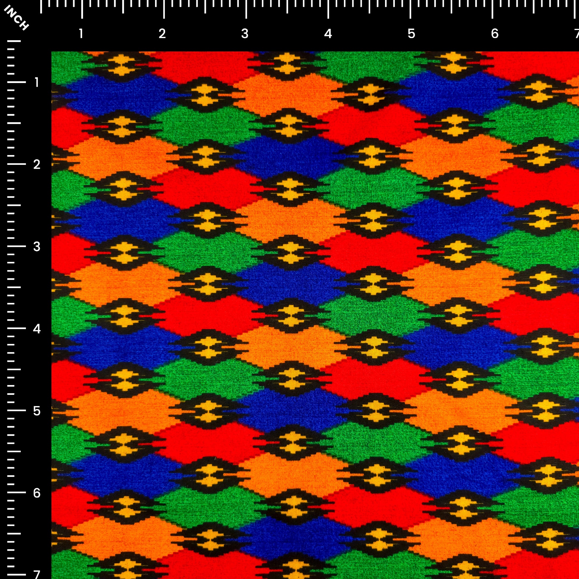 Ethnic Nepali Dhaka Printed Poplin Fabric features a vibrant all-over geometric arrangement inspired by traditional Nepali Dhaka artistry. The pattern is composed of rhythmic diamond shapes and elongated ikat-style motifs arranged in a balanced repeat, creating a bold yet structured ethnic aesthetic. The design reflects cultural richness while maintaining a clean and modern finish, making it suitable for both traditional and contemporary silhouettes.