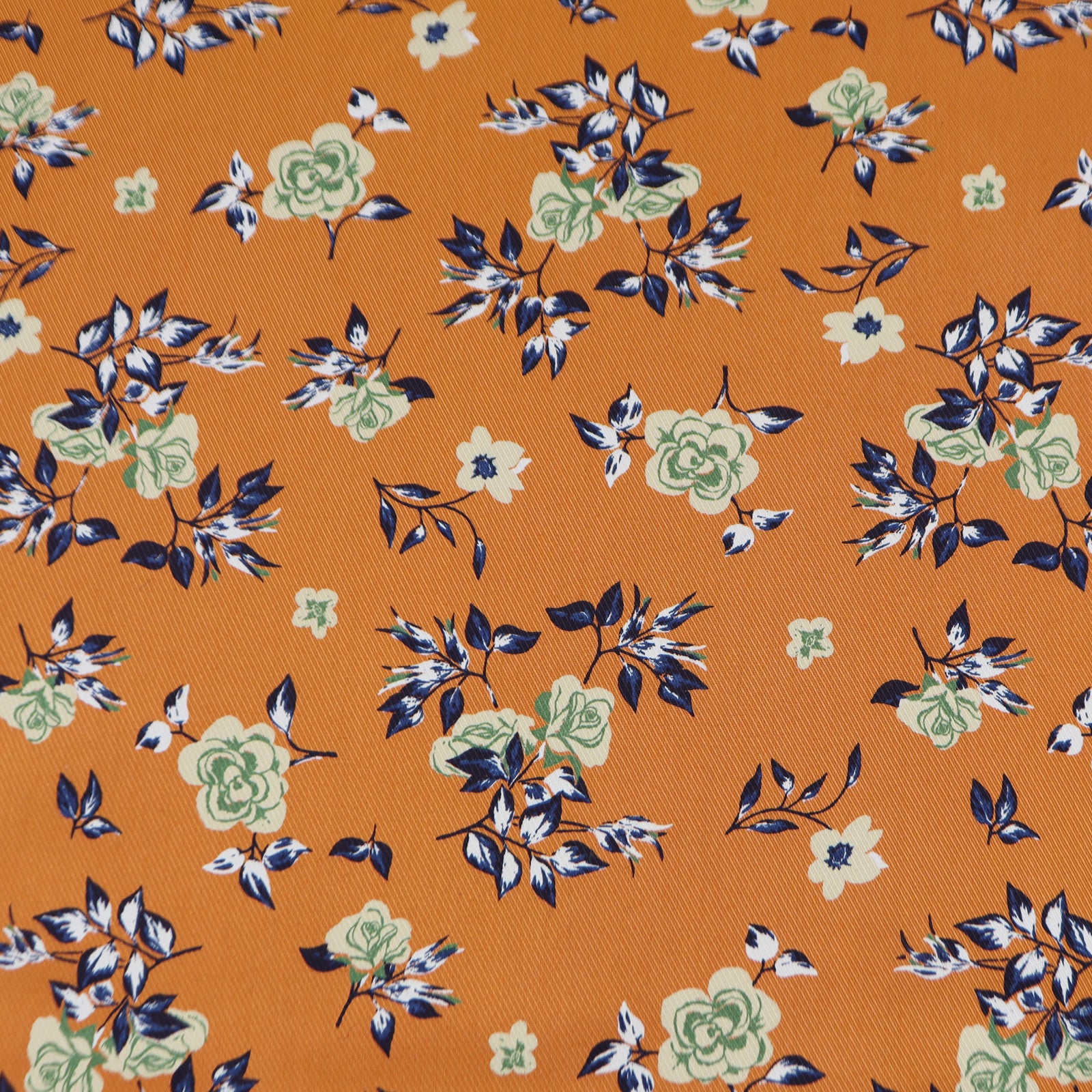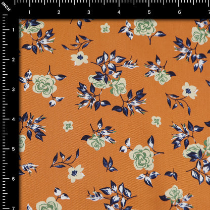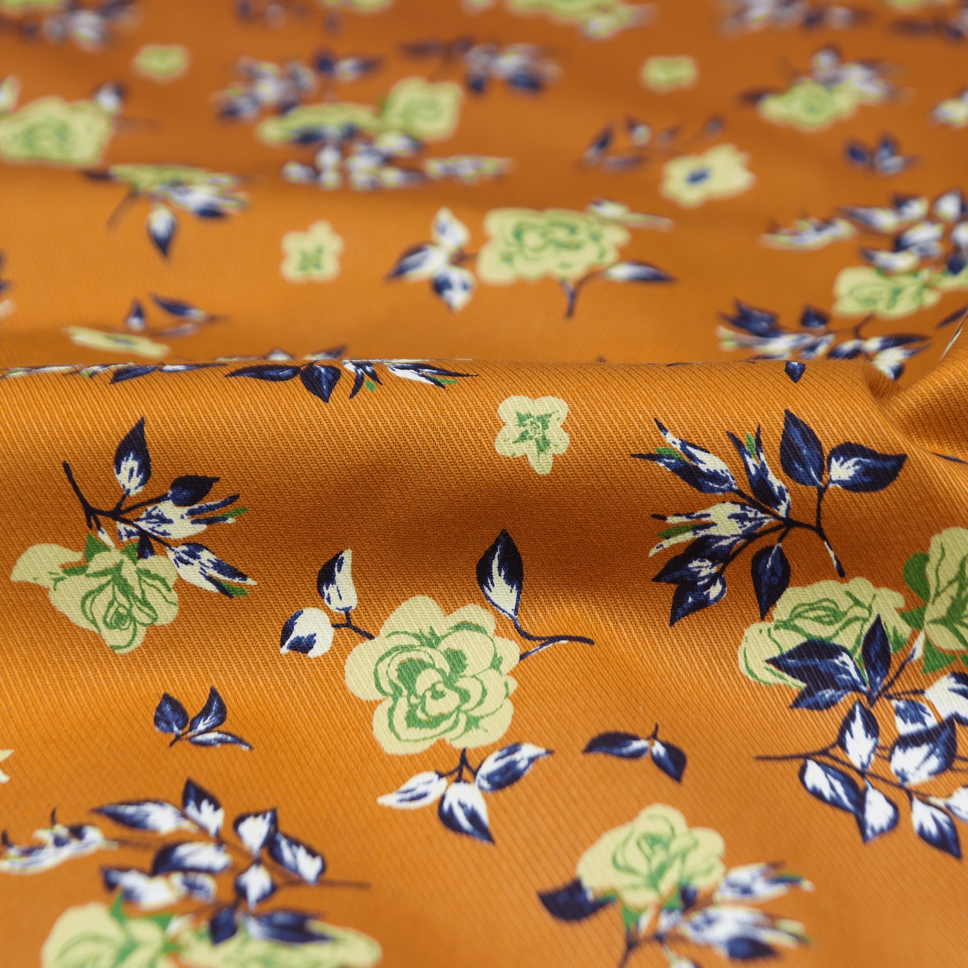 This floral printed twill fabric features artistically arranged flower clusters combined with soft foliage elements, creating a balanced and elegant all-over pattern. The design blends medium floral bunches with smaller accent flowers, giving the fabric a graceful, versatile look suitable for both everyday and semi-formal garments. The natural diagonal texture of twill enhances the artwork, adding depth, richness, and a premium finish to the pattern.