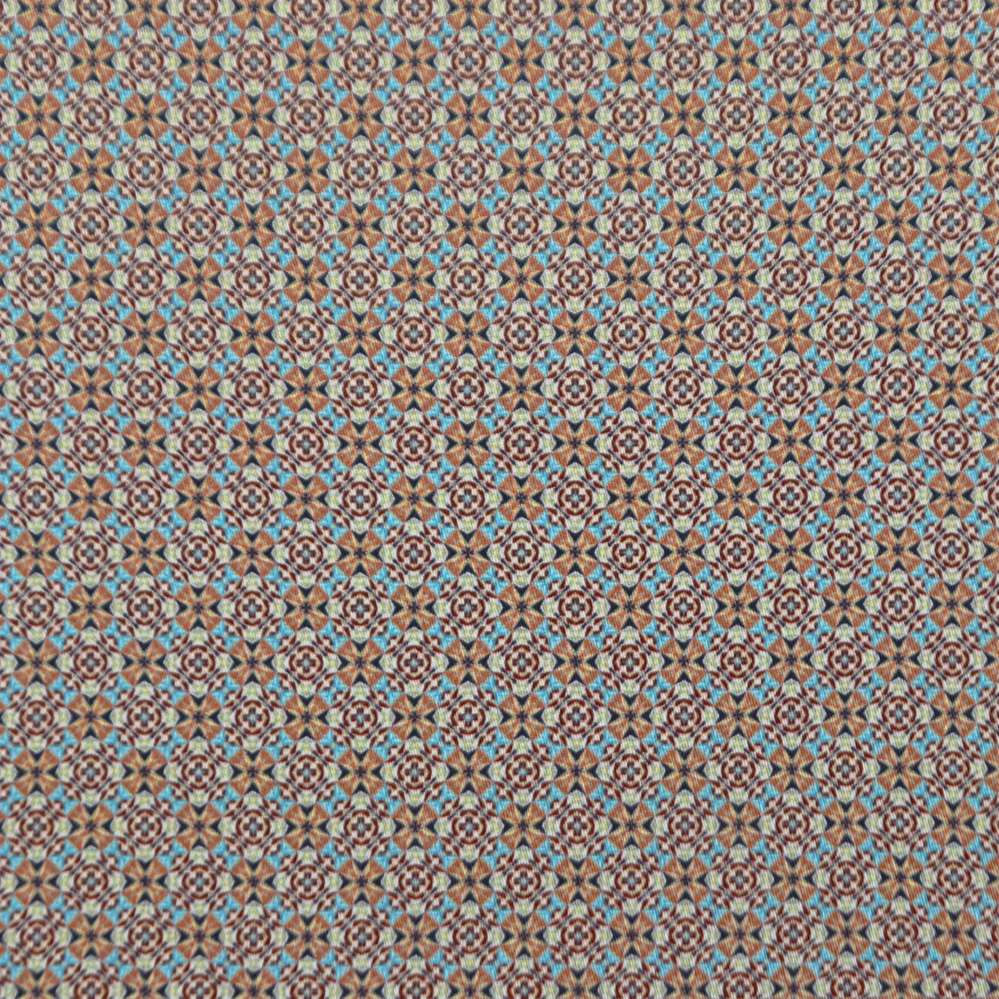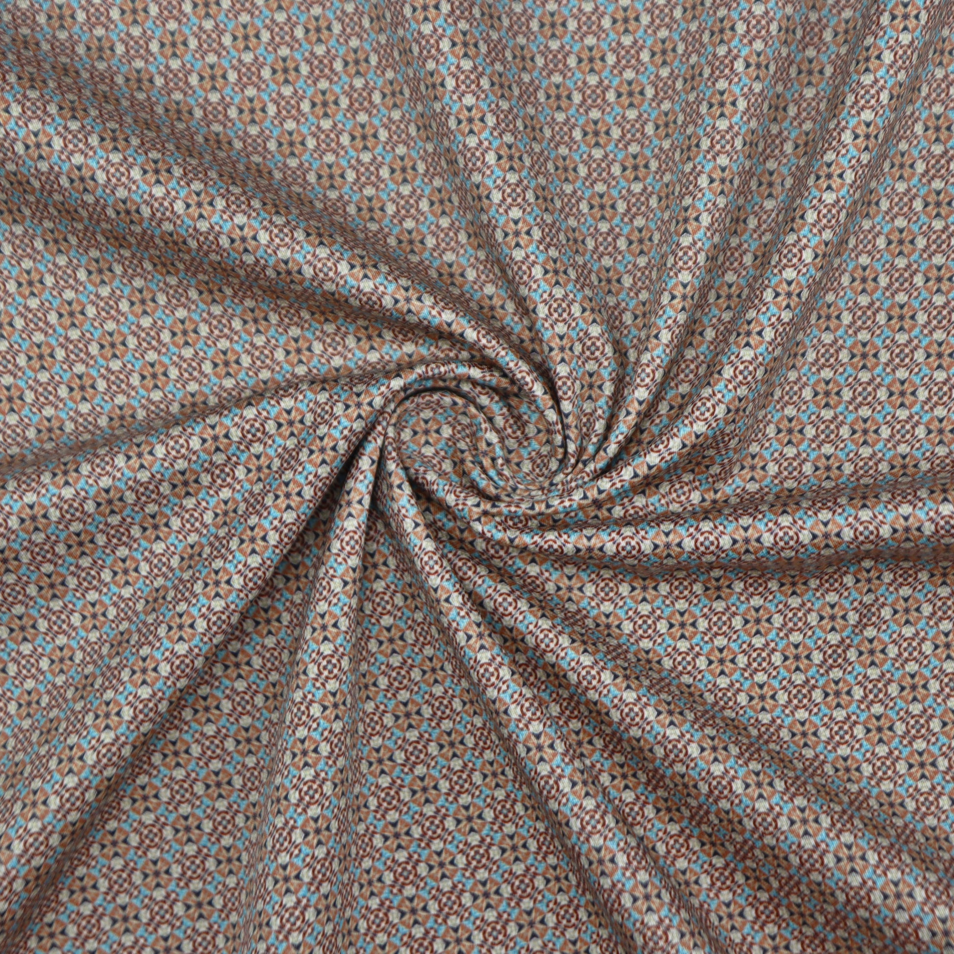 This premium digital satin fabric features a finely detailed geometric mosaic composed of tightly repeated diamond and rosette motifs. The design creates a rhythmic, all-over pattern with a strong sense of symmetry and precision, offering a refined visual texture that feels both intricate and balanced. Its compact repeat and ornamental structure make it ideal for garments that demand subtle richness without overpowering the silhouette.