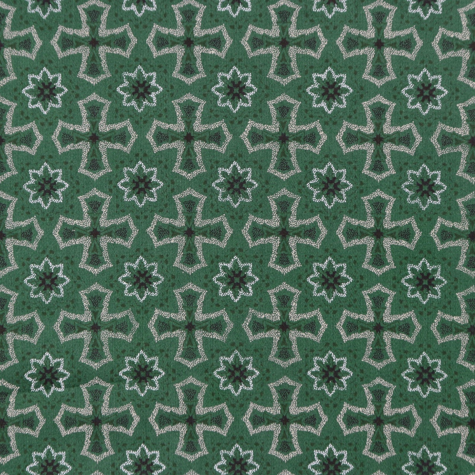 This Heritage Motif Satin Fabric showcases a repeating geometric-inspired motif arranged in a balanced and symmetrical layout. The design draws from traditional ornamental patterns, creating a structured yet decorative surface that feels classic and timeless. The evenly spaced motifs give the fabric a harmonious rhythm, making it suitable for both statement pieces and refined everyday garments.