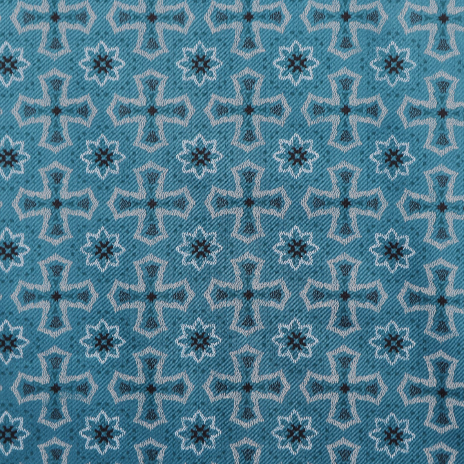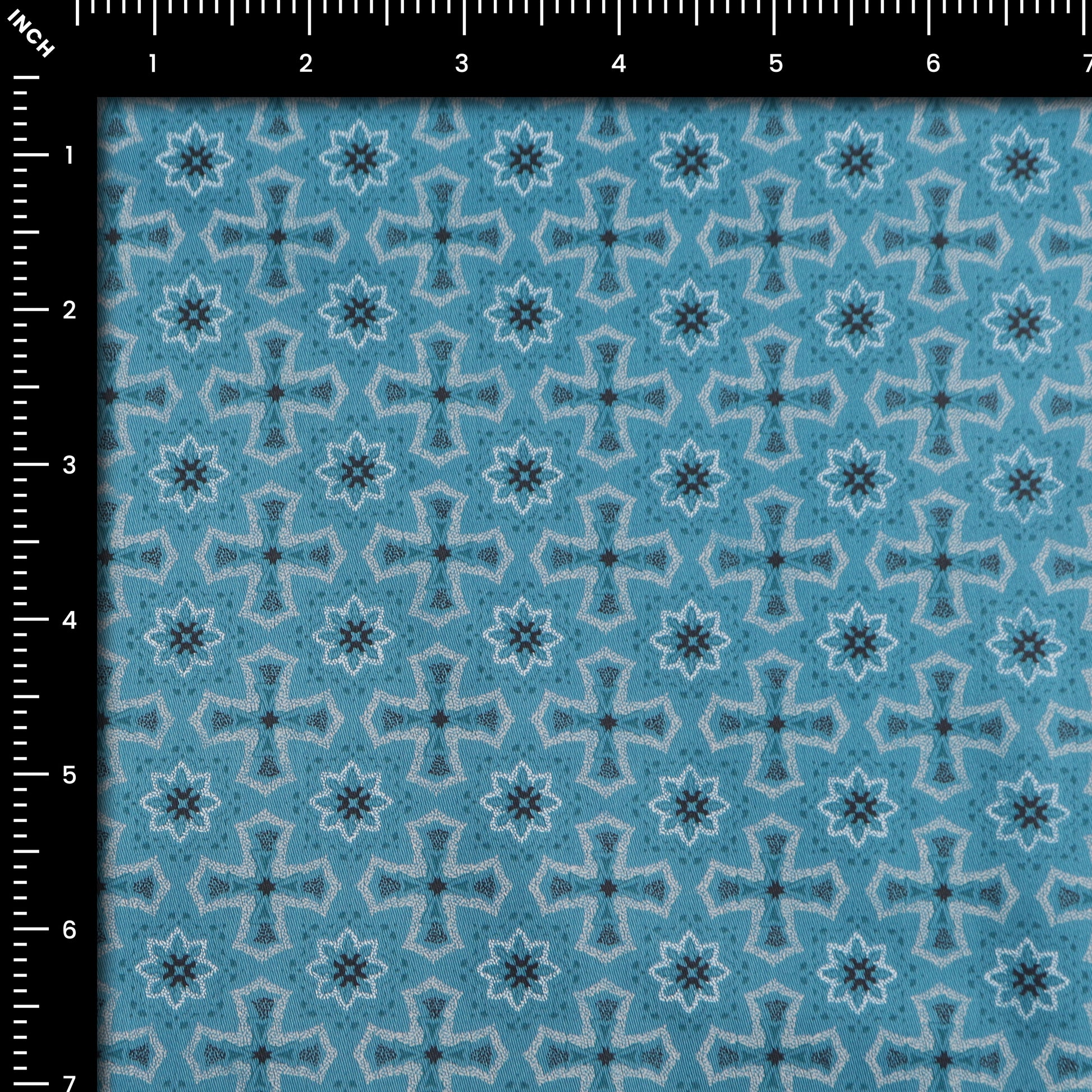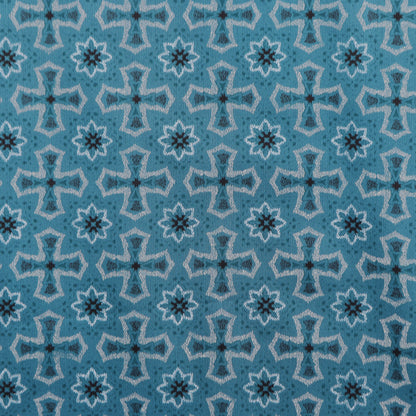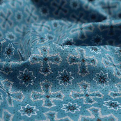 This Heritage Motif Satin Fabric showcases a repeating geometric-inspired motif arranged in a balanced and symmetrical layout. The design draws from traditional ornamental patterns, creating a structured yet decorative surface that feels classic and timeless. The evenly spaced motifs give the fabric a harmonious rhythm, making it suitable for both statement pieces and refined everyday garments.