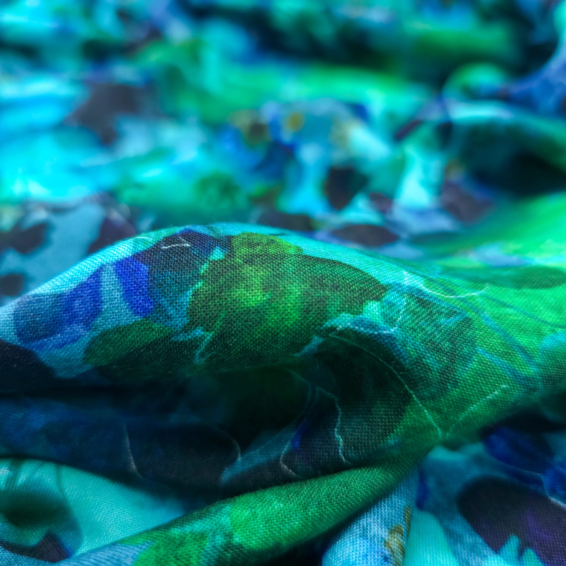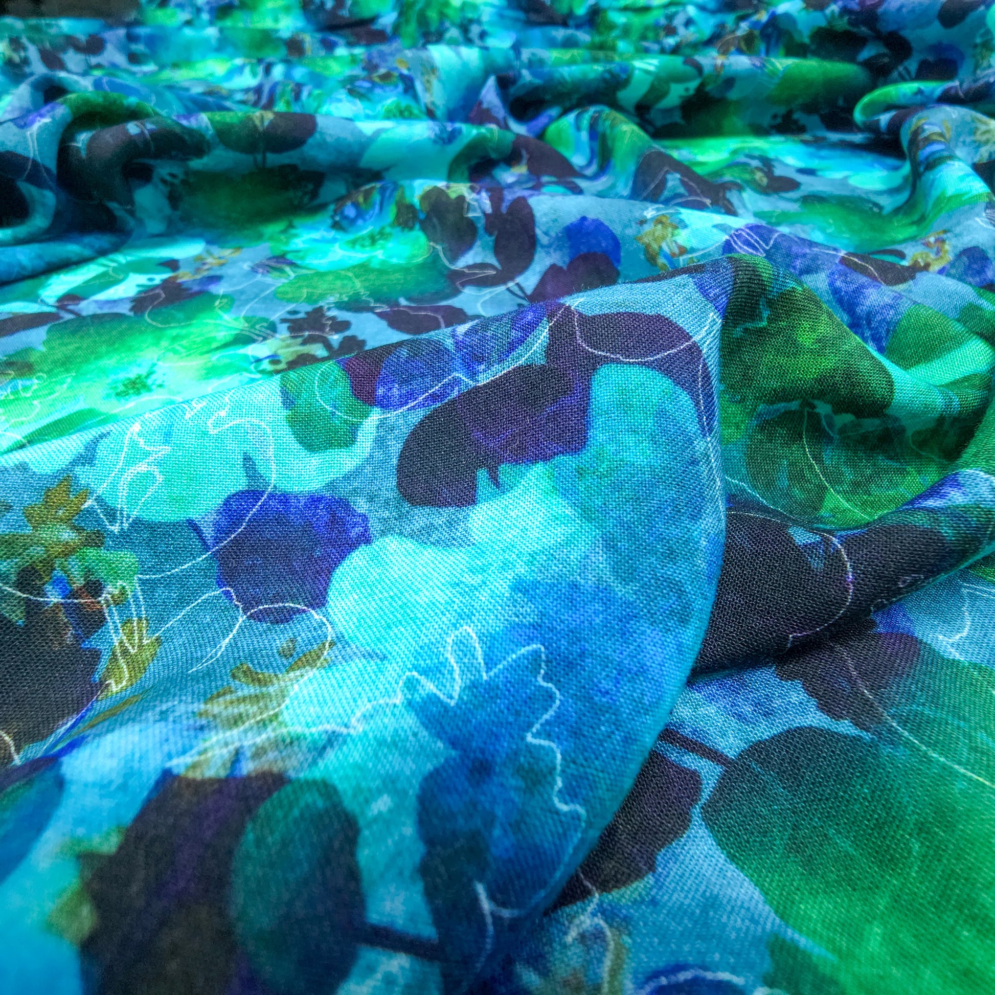 Ocean Mist Floral Printed Rayon Fabric features a beautifully layered botanical composition inspired by fluid watercolor florals. The design blends soft floral silhouettes with abstract overlays, creating depth and movement across the surface. The seamless repeat pattern gives it a balanced yet expressive appearance, making it ideal for contemporary fashion pieces that require both elegance and artistic character.