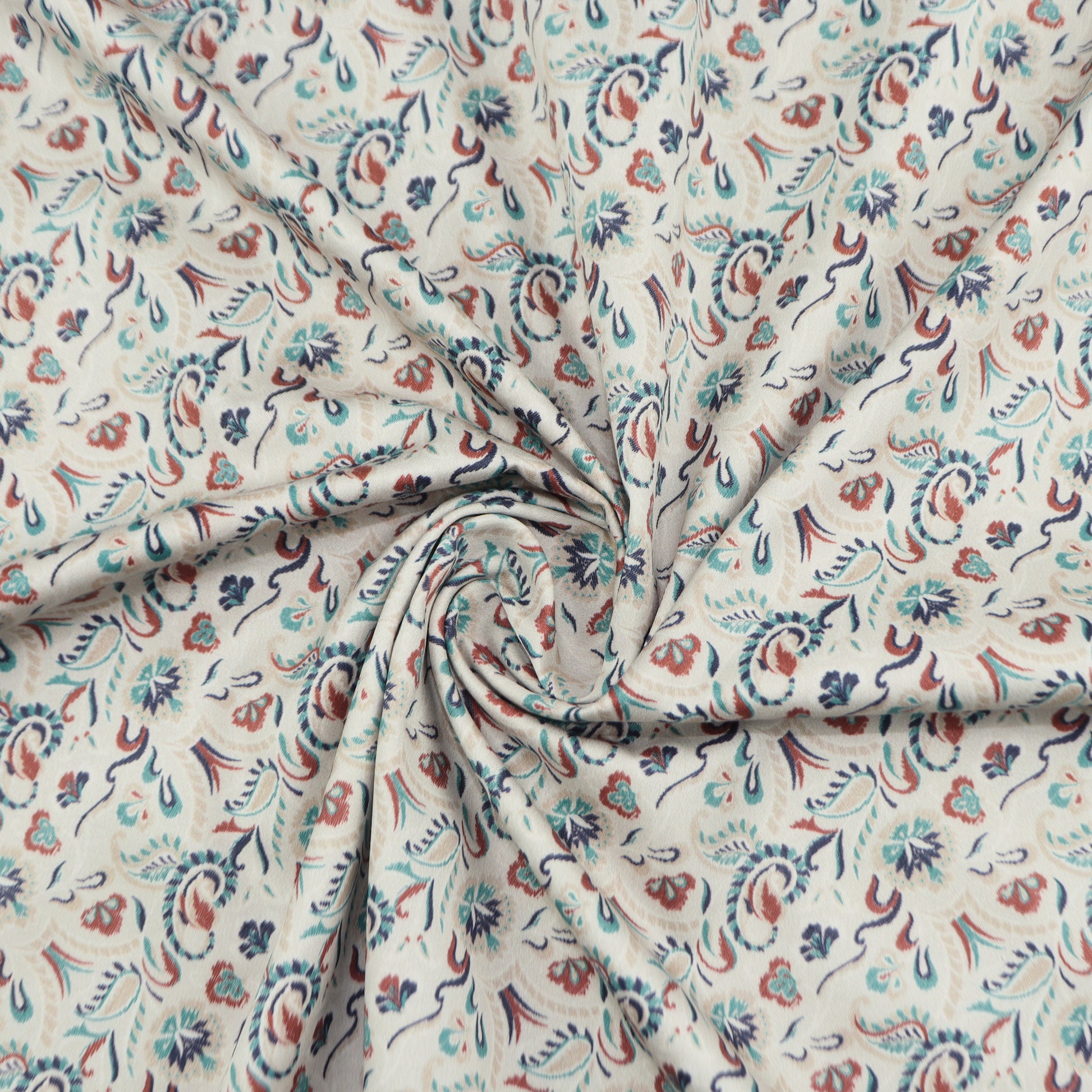 This premium digital satin fabric features an elegant all-over paisley floral composition with flowing vines, delicate botanicals, and softly curved motifs. The design balances traditional ornamentation with a refined, contemporary rhythm, creating a timeless pattern that feels graceful and wearable. Its seamless repeat and fluid detailing give the fabric a classic yet versatile appeal, ideal for elevated everyday and occasion wear.