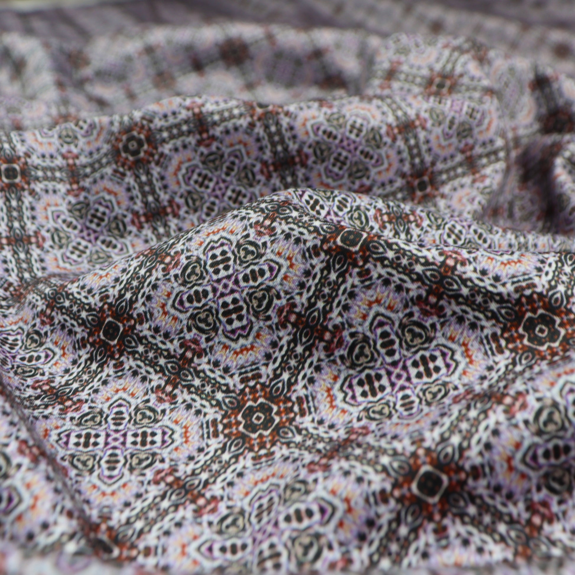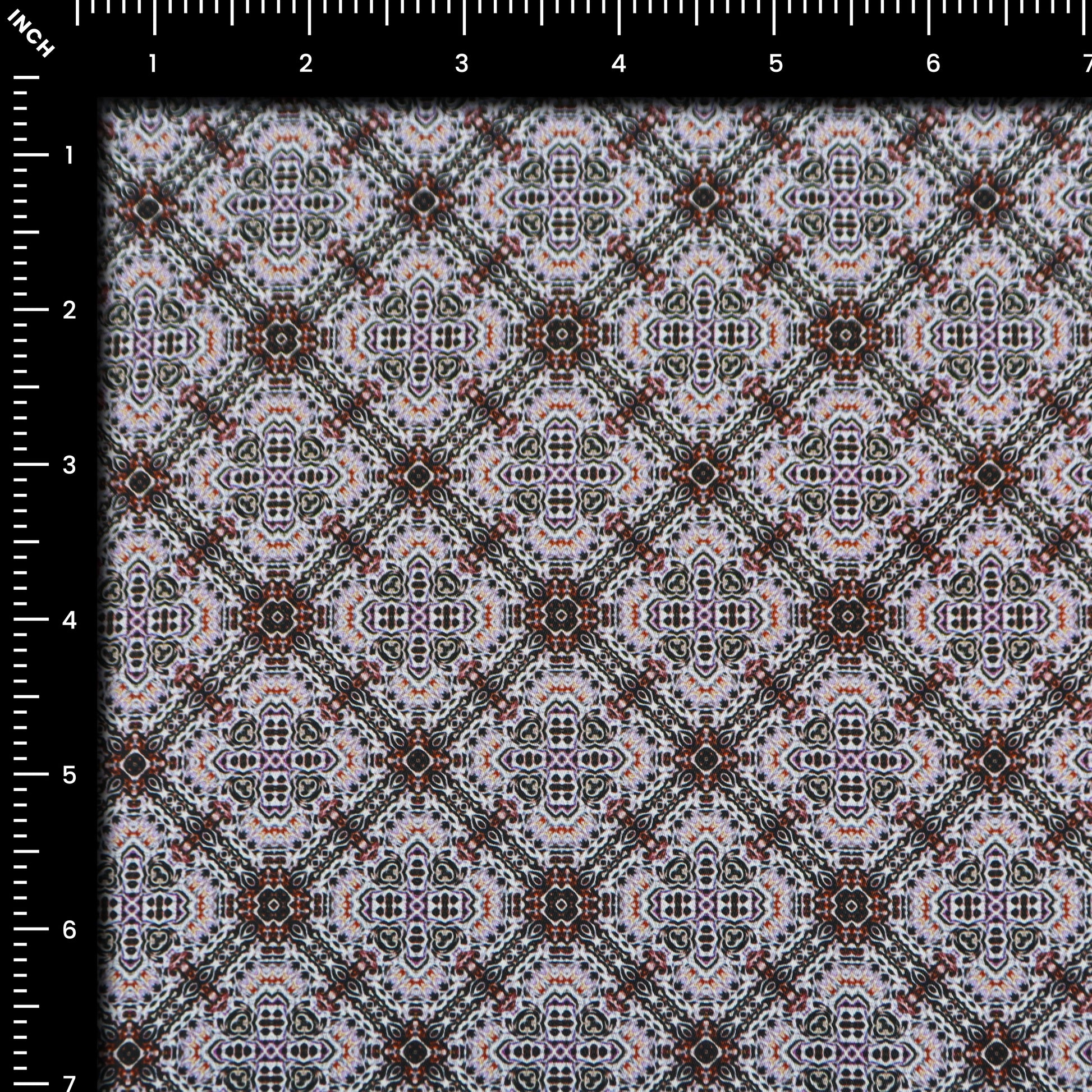 This digitally printed satin cotton fabric showcases an intricate symmetrical medallion pattern inspired by ornamental geometry and kaleidoscopic detailing. The repeating motifs create a sense of rhythm and balance, giving the fabric a bold yet refined visual character. Its layered symmetry and fine detailing make it ideal for statement garments with a premium, contemporary appeal.