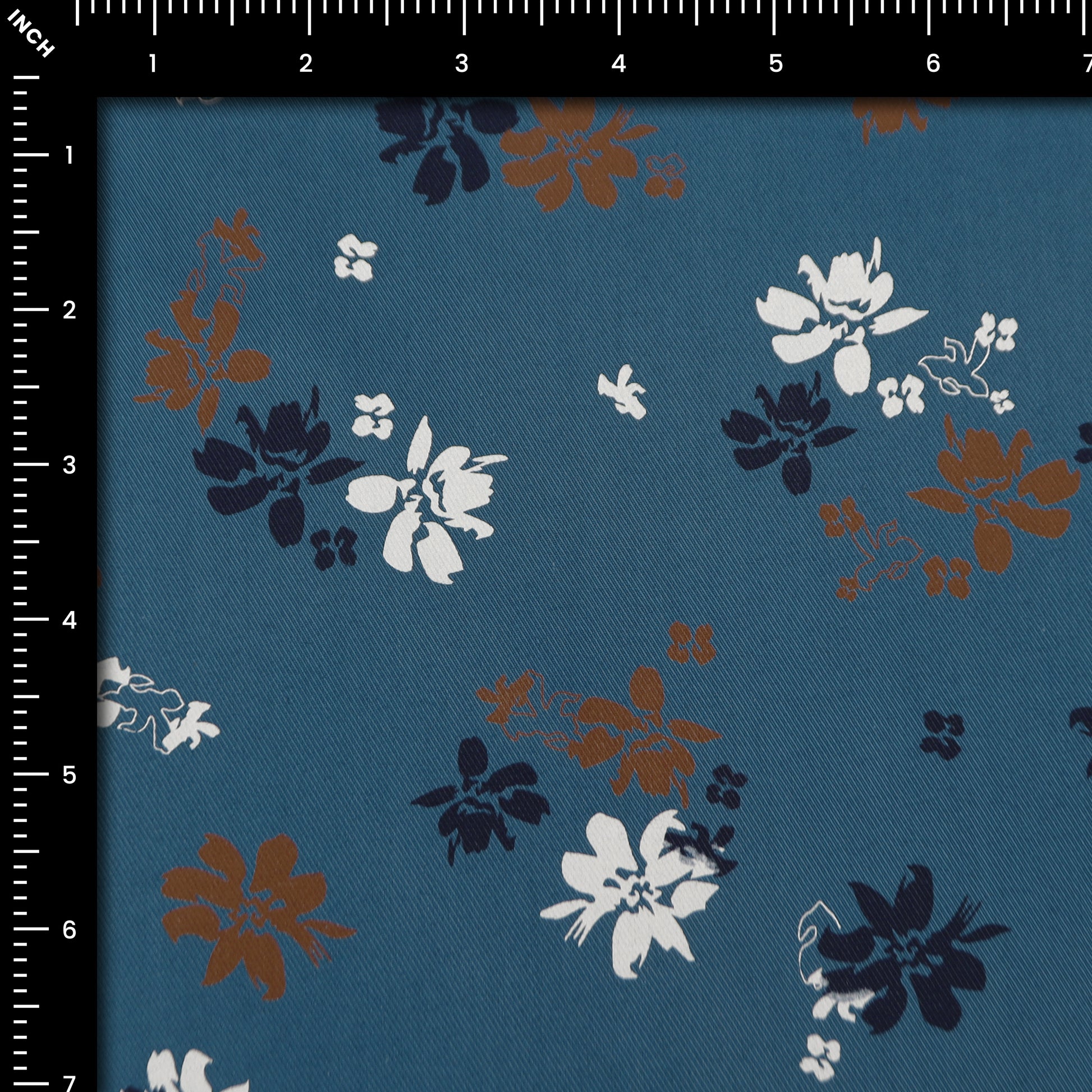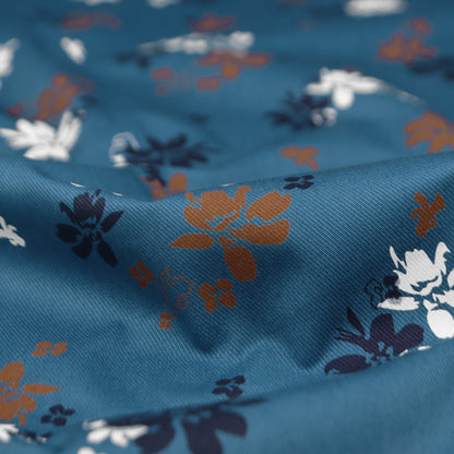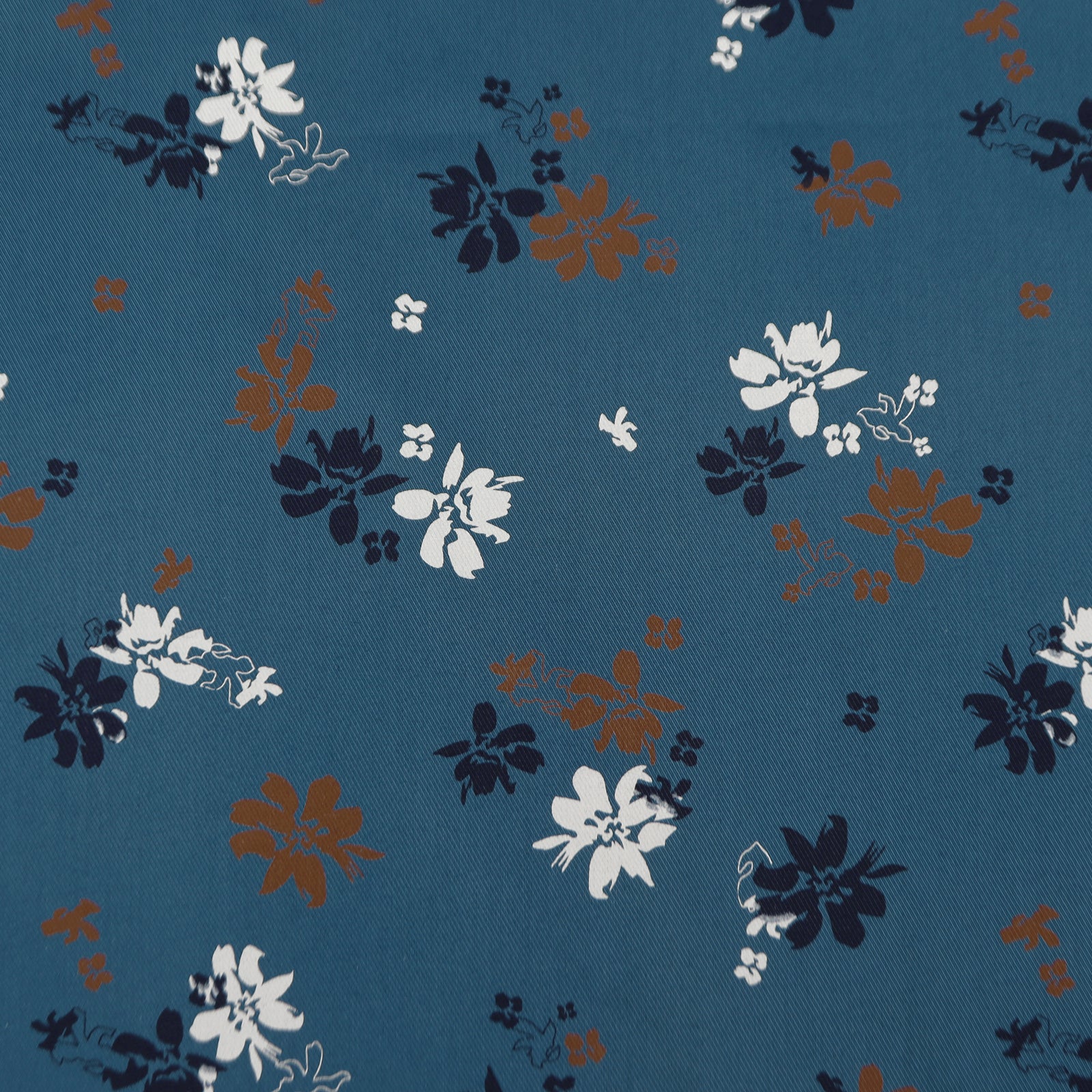 This floral cluster printed twill fabric features expressive flower silhouettes arranged in a scattered, free-flowing layout. The design blends bold floral shapes with smaller accent blossoms and minimalist leaf elements, giving the fabric a lively yet balanced visual rhythm. The pattern works beautifully for garments that demand a touch of modern freshness without being overly dense or heavy.