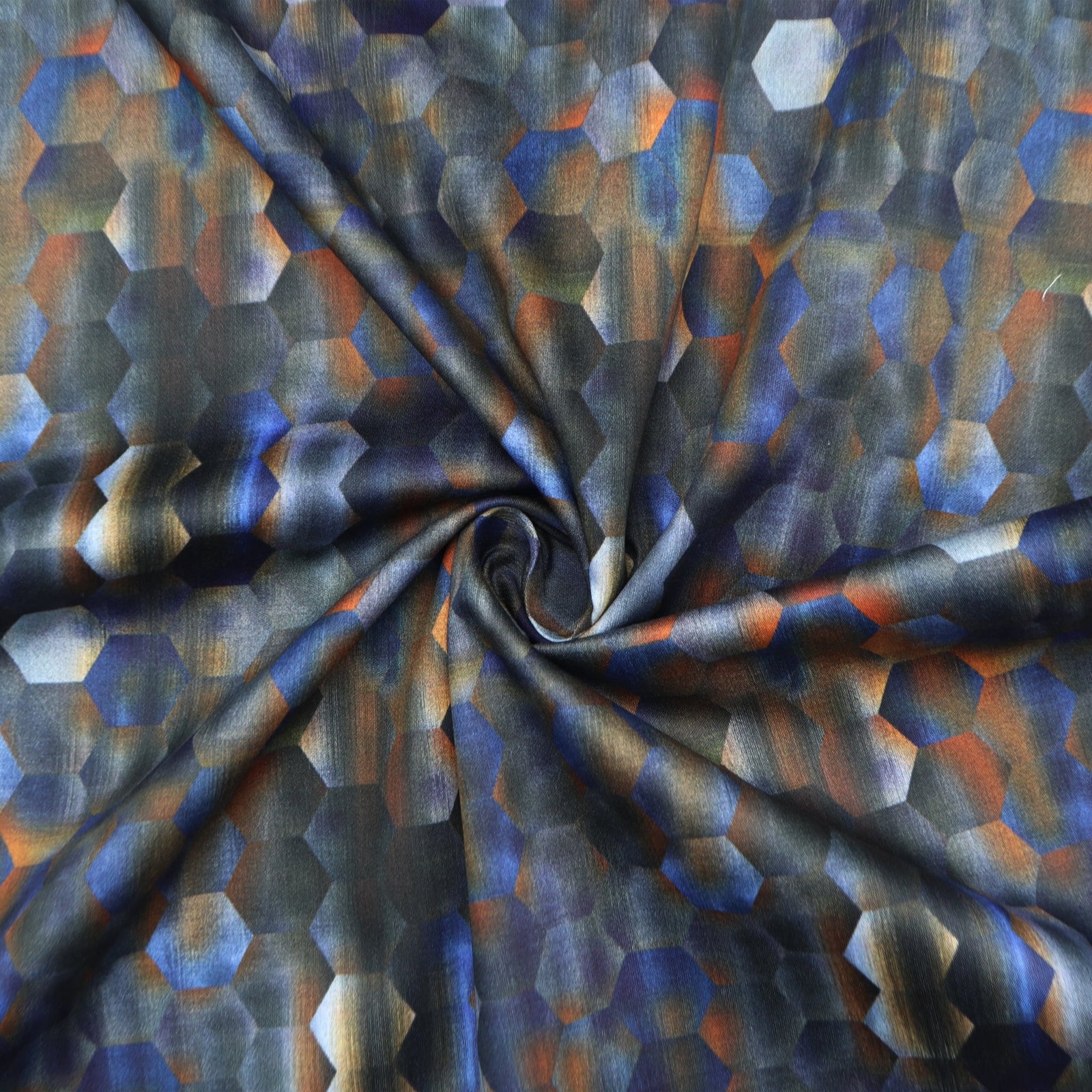 Prism Hexagon Satin Fabric features a repeating hexagonal layout that creates a layered, mosaic-like surface with a sense of depth and movement. The geometric forms are closely arranged, giving the pattern a rhythmic and contemporary appearance while still feeling balanced and cohesive. The design has a refined visual complexity that works well for statement pieces as well as coordinated collections where texture and pattern play a central role.
