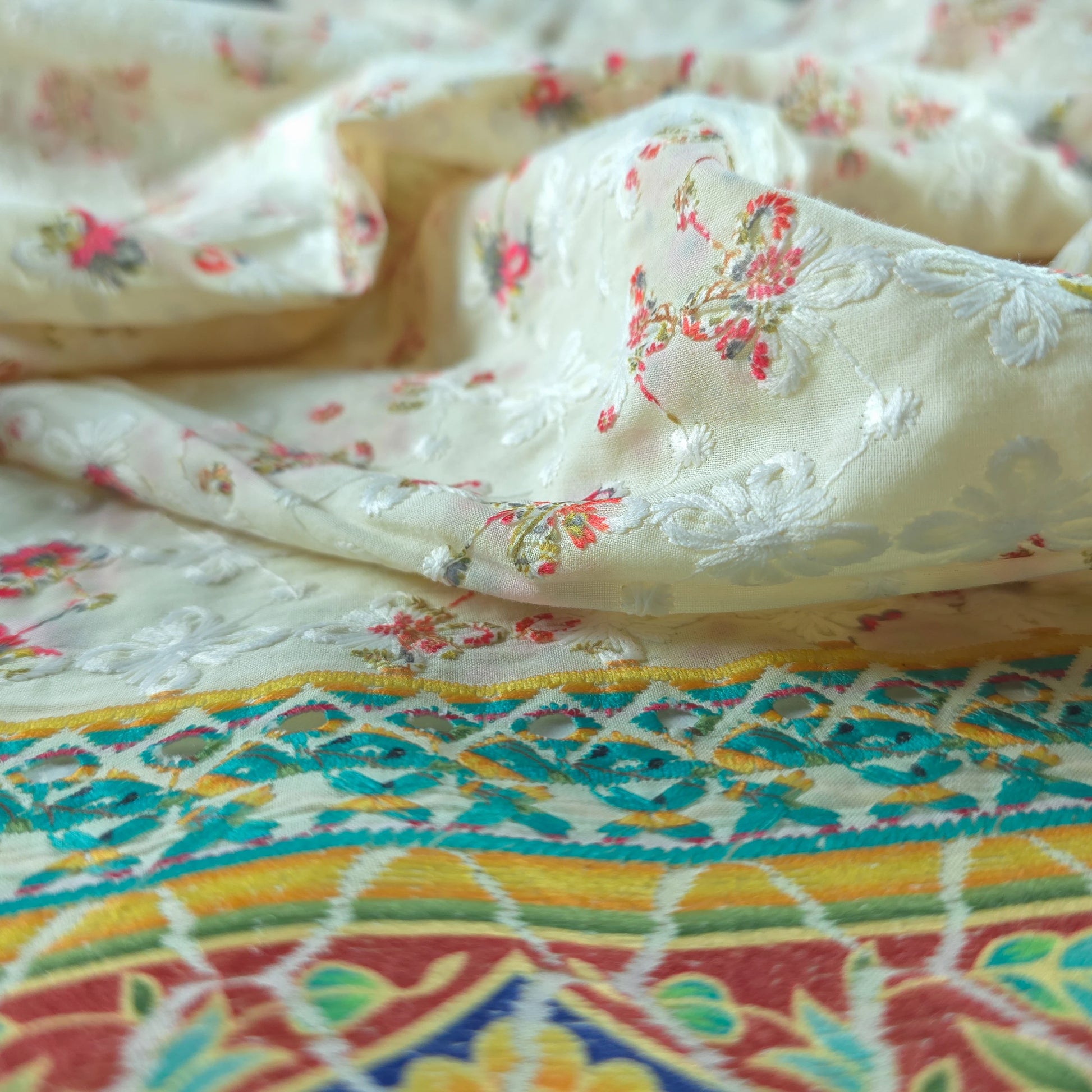 Royal Mughal Floral Border Schiffli Cambric Fabric features an elegant all-over floral layout enhanced with delicate schiffli embroidery and a richly ornamented endless border inspired by Mughal artistry. The body of the fabric showcases finely spaced floral motifs layered over an embroidered base, creating soft texture and graceful visual depth. The detailed border design adds architectural richness and a regal frame to the fabric, making it ideal for silhouettes that emphasize hems, panels, and statement edges. The seamless border continuity ensures a cohesive and polished overall look.