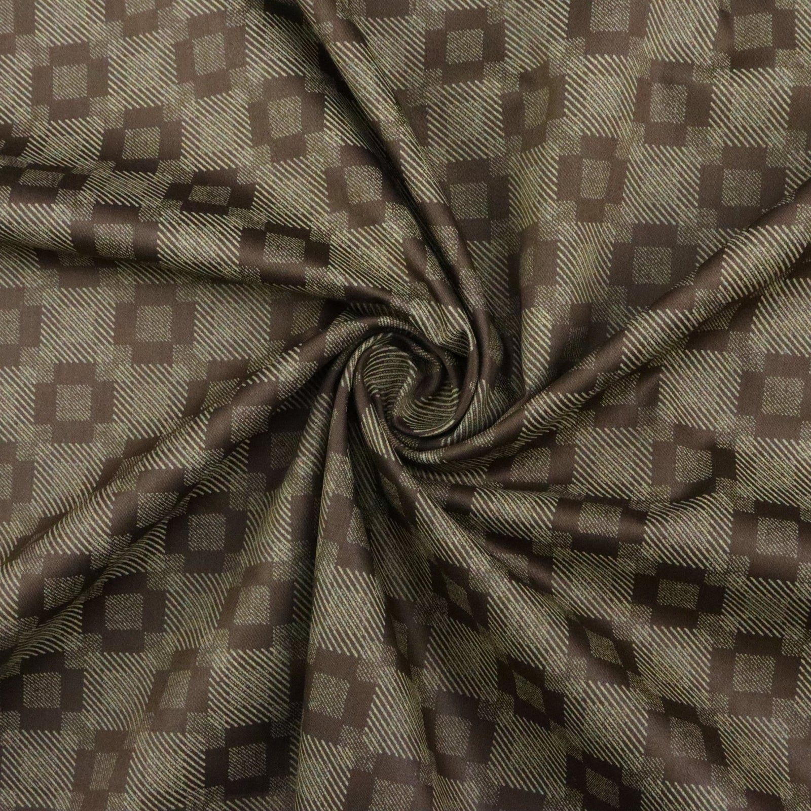 This Shadow Check Satin Fabric features a refined checkered pattern created through subtle tonal contrasts and textured detailing. The geometric arrangement gives the surface a modern, understated character, making it versatile enough for both formal and casual silhouettes. The repeating checks add depth without overpowering the overall look, resulting in a clean and balanced design.