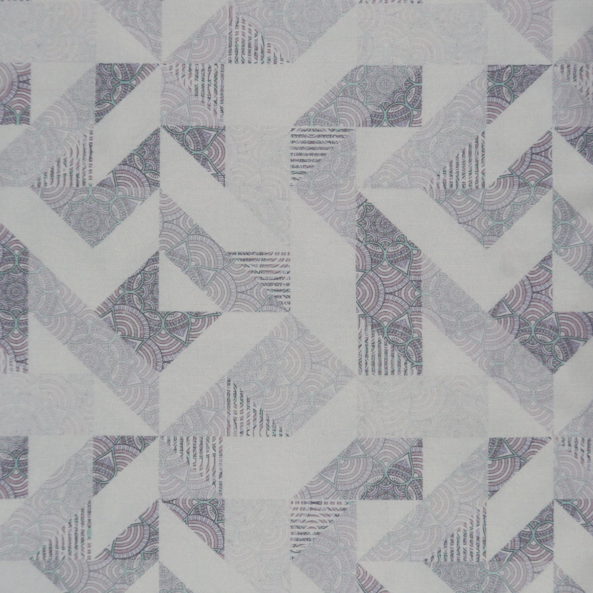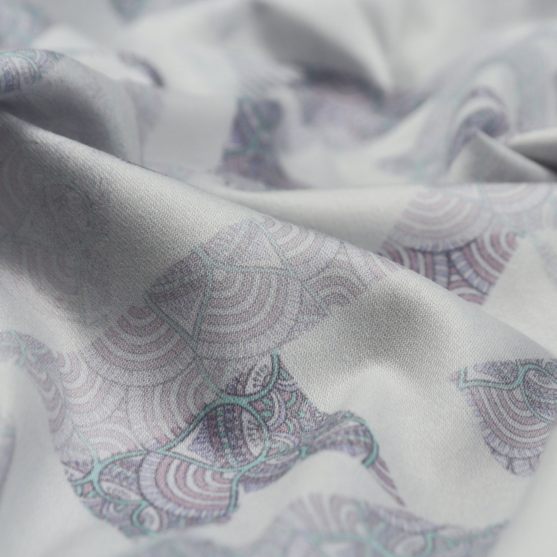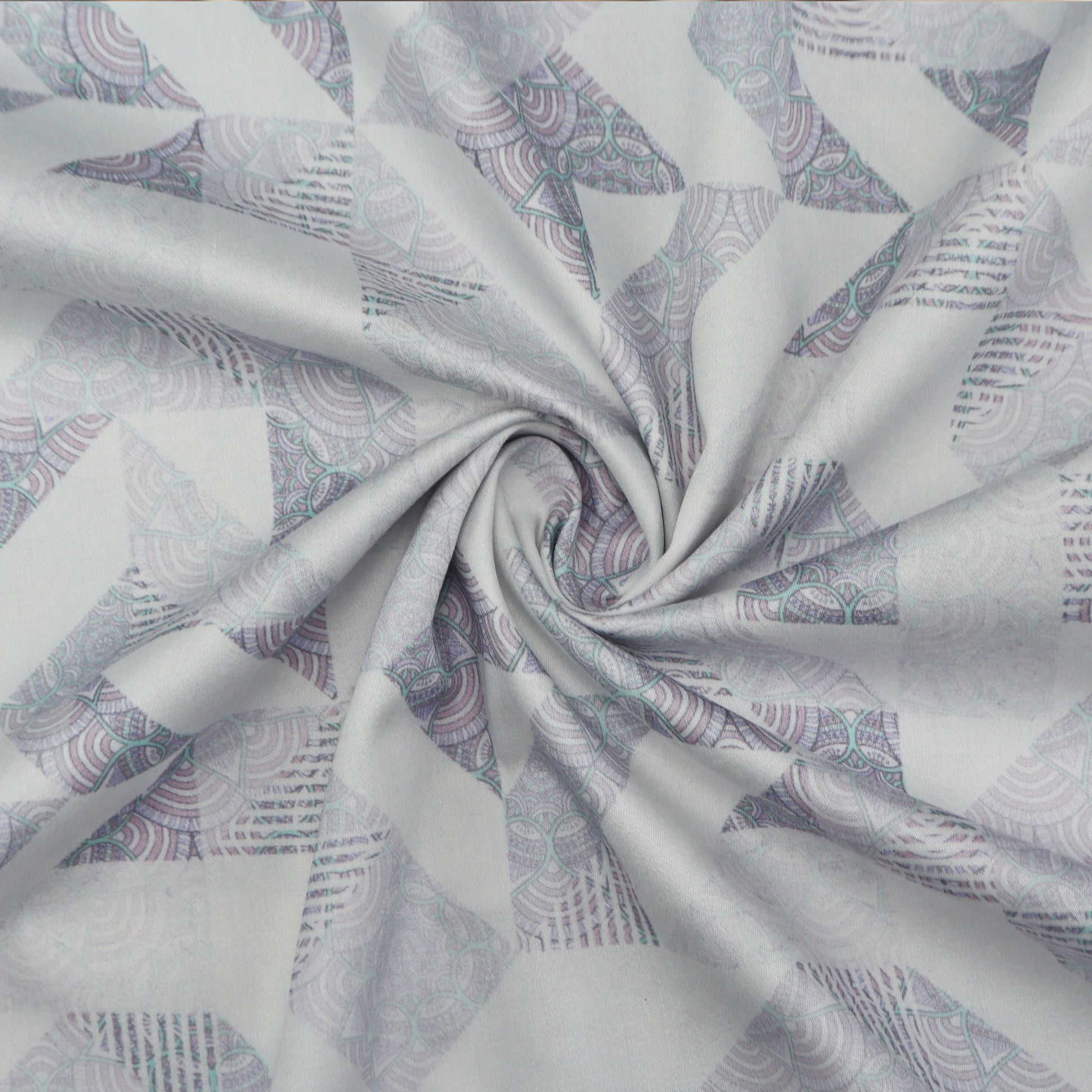 This premium digital satin fabric features a subtle abstract geometric overlay composed of interlocking shapes, directional strokes, and layered pattern fragments. The design balances soft tonal transitions with structured geometry, creating a calm yet contemporary visual rhythm. Its muted, single-tone appearance lends a refined, understated elegance while retaining depth and texture, making it ideal for clean, modern garments.