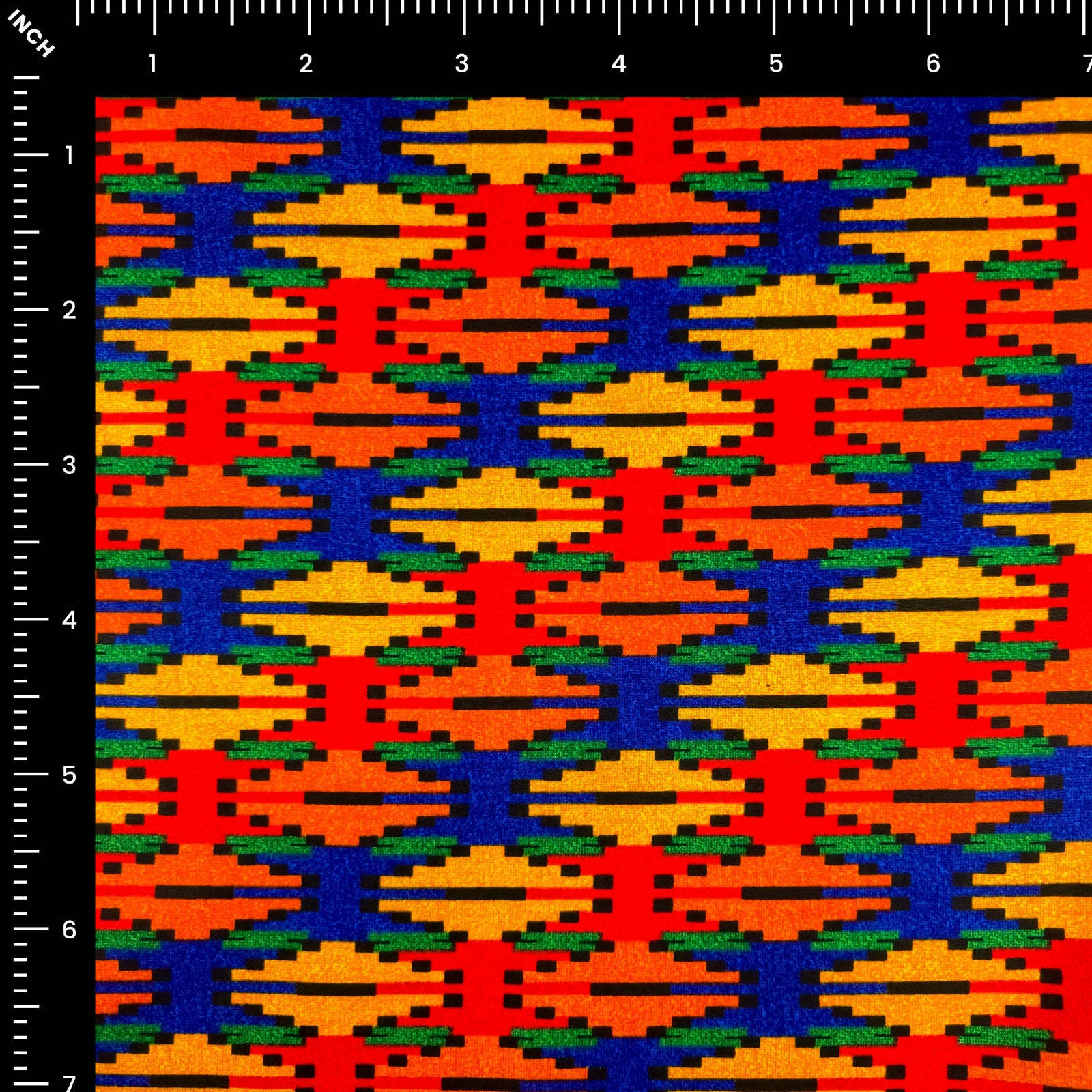 Timeless Nepali Dhaka Poplin Fabric features a vibrant all-over geometric arrangement inspired by traditional Nepali Dhaka artistry. The pattern is composed of elongated ikat-style motifs and stepped linear accents arranged in rhythmic horizontal bands, creating a bold yet structured ethnic aesthetic. The continuous repeat reflects cultural heritage and classic woven influences while maintaining a clean and visually dynamic finish, making it suitable for both traditional attire and contemporary silhouettes.