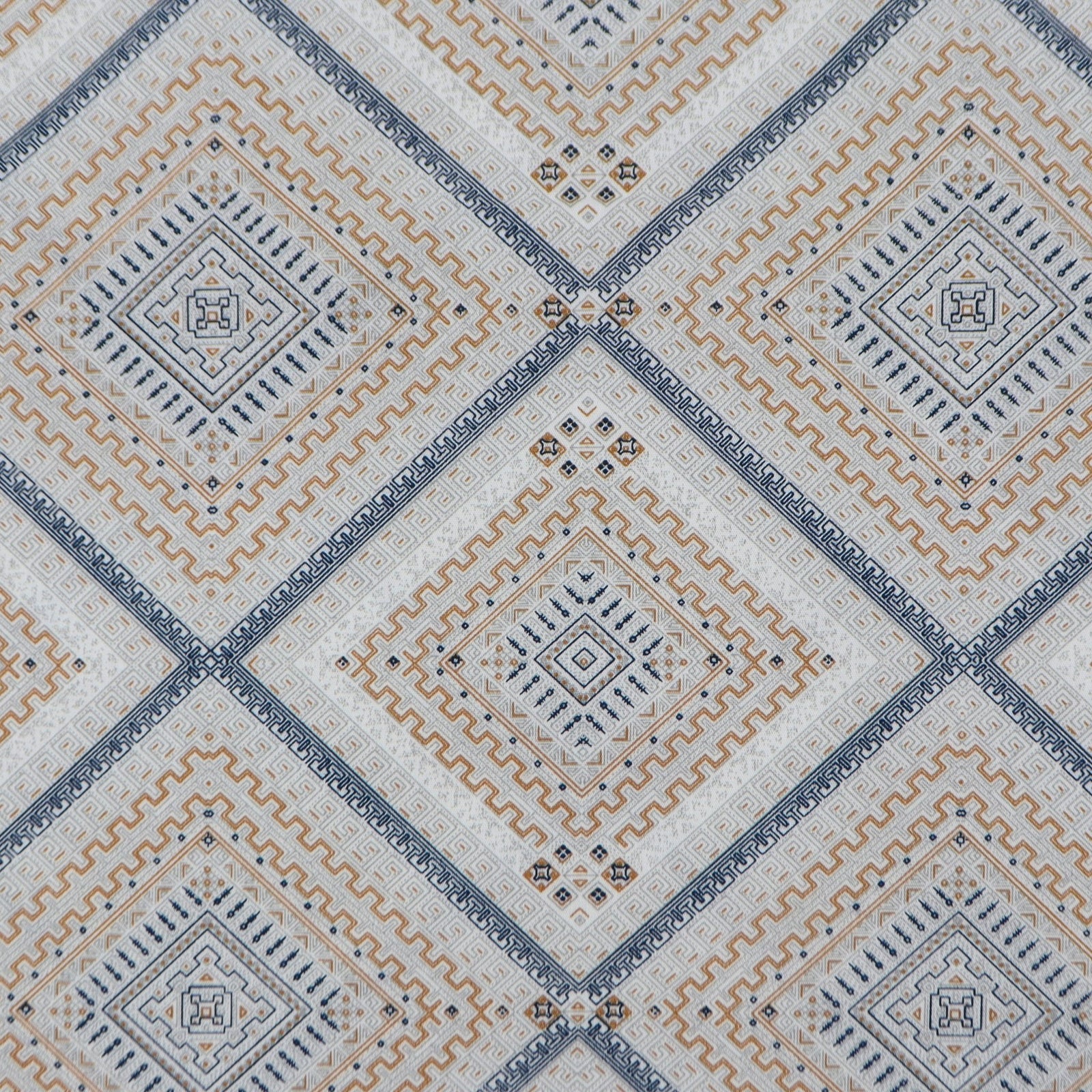 This Tribal Diamond Poplin Fabric features a bold geometric layout inspired by traditional tribal motifs. Repeating diamond formations are arranged in a precise, symmetrical pattern, enhanced with fine linear and ornamental detailing. The structured design creates a visually striking surface that balances heritage-inspired aesthetics with modern geometric clarity.