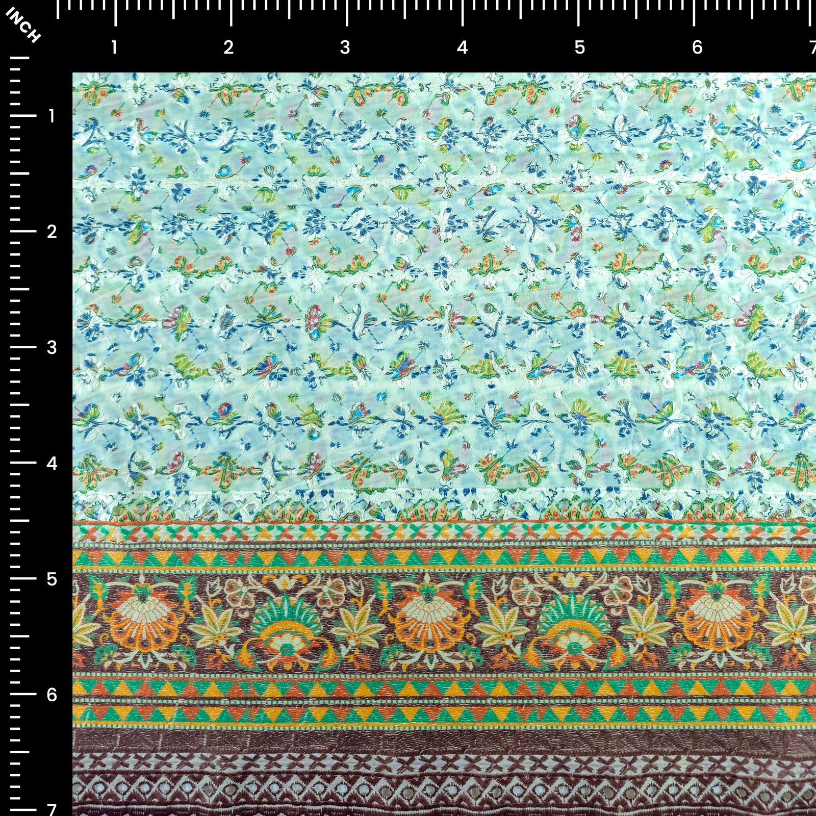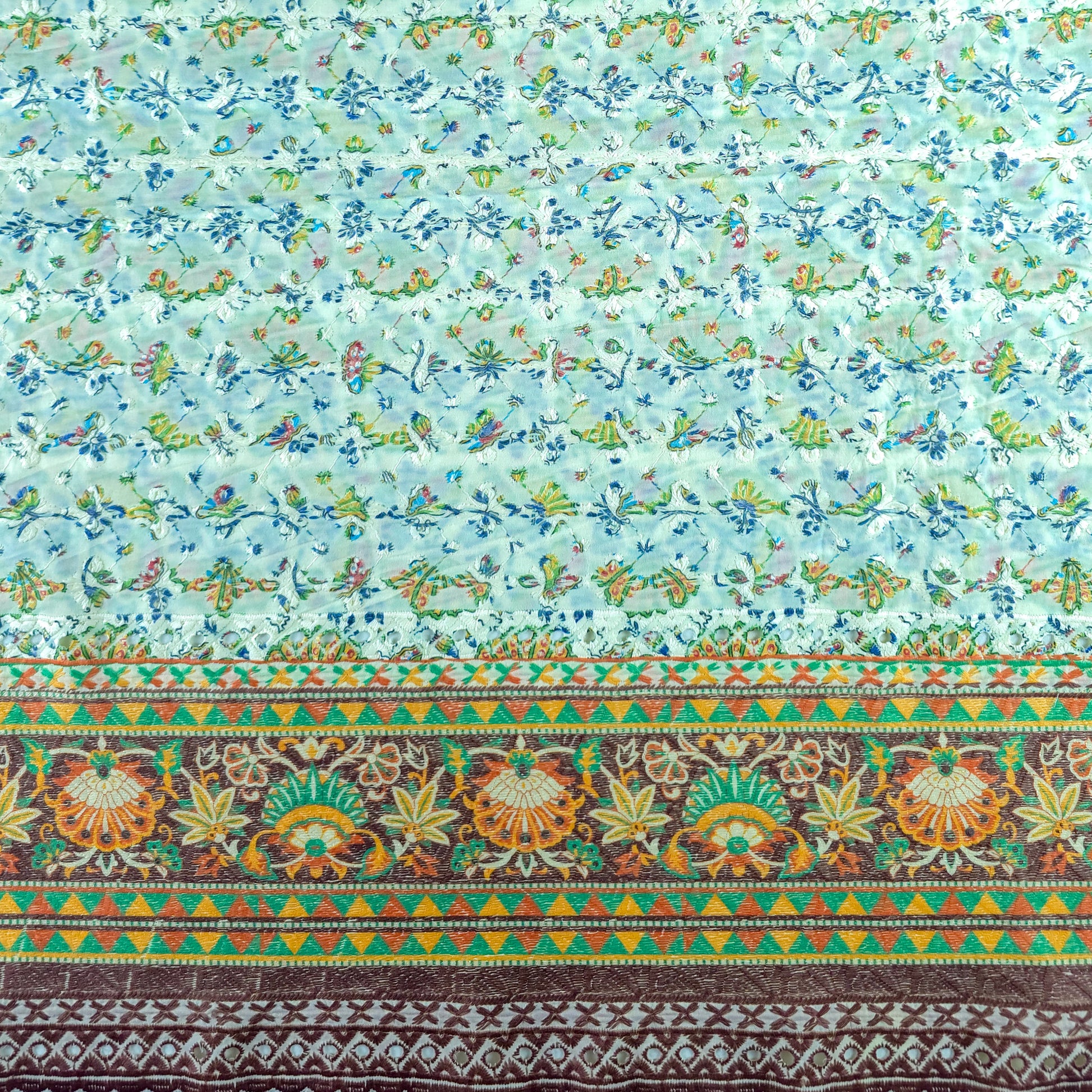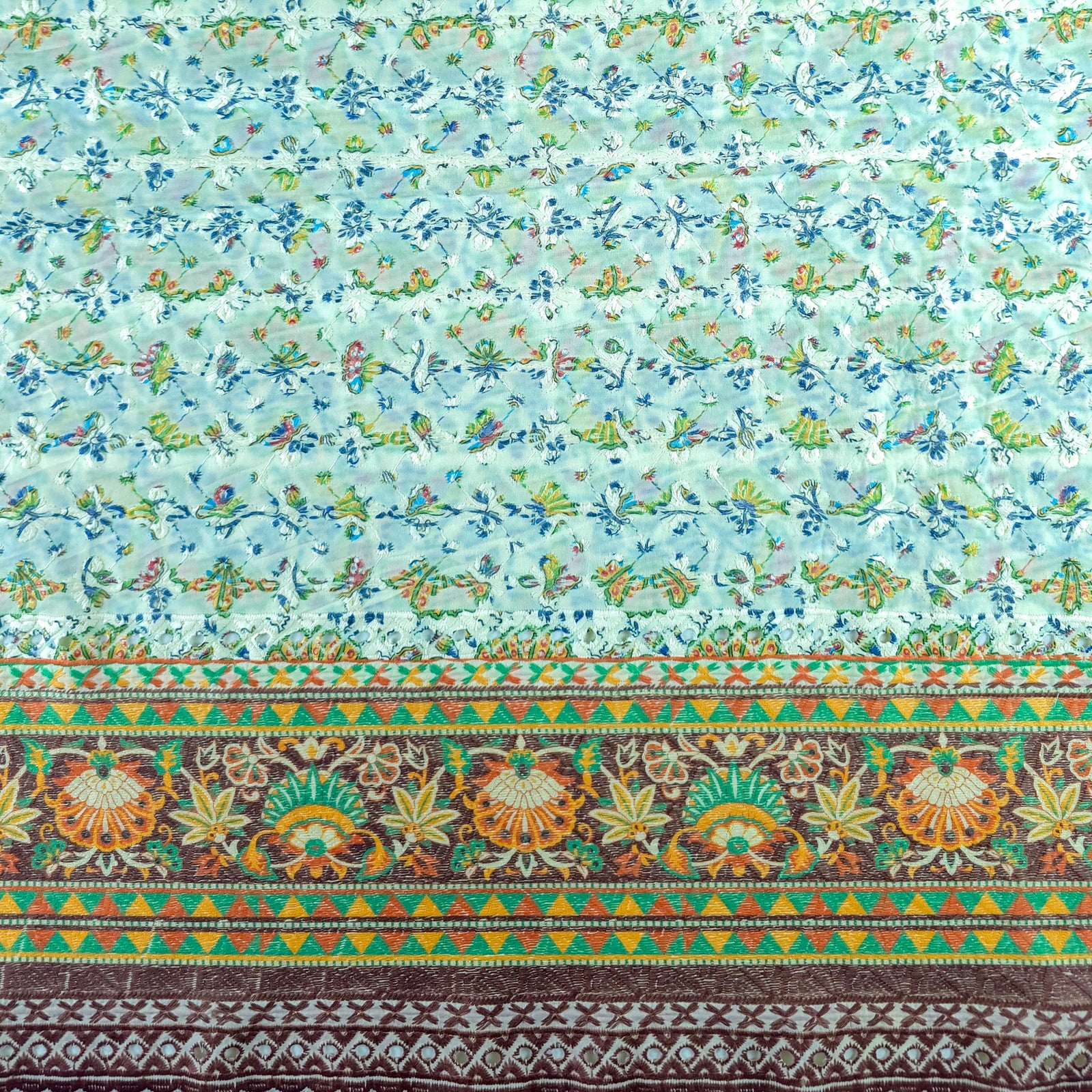 Vintage Floral Border Schiffli Cambric Fabric features a finely detailed floral layout enhanced with delicate schiffli embroidery and a richly patterned endless border. The body showcases small, intricately spaced floral motifs layered over an embroidered base, creating gentle texture and visual depth. The ornamental border adds a structured and decorative finish, making the fabric ideal for garments that emphasize hems, panels, and statement edges. The seamless border continuity ensures a cohesive design flow across the entire length of the fabric.